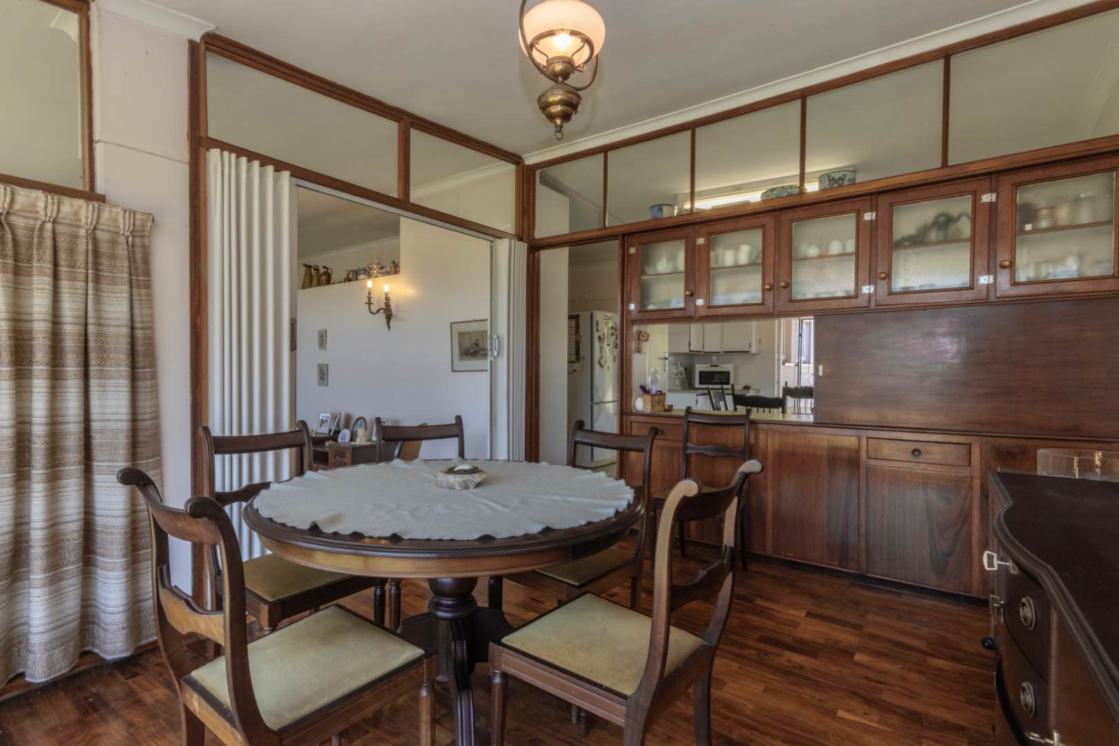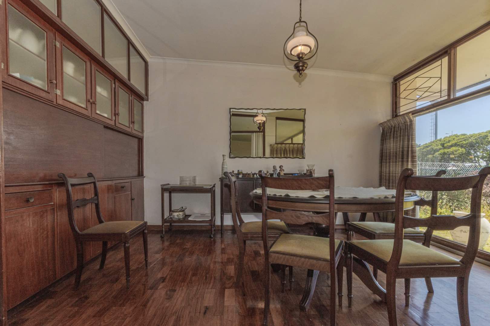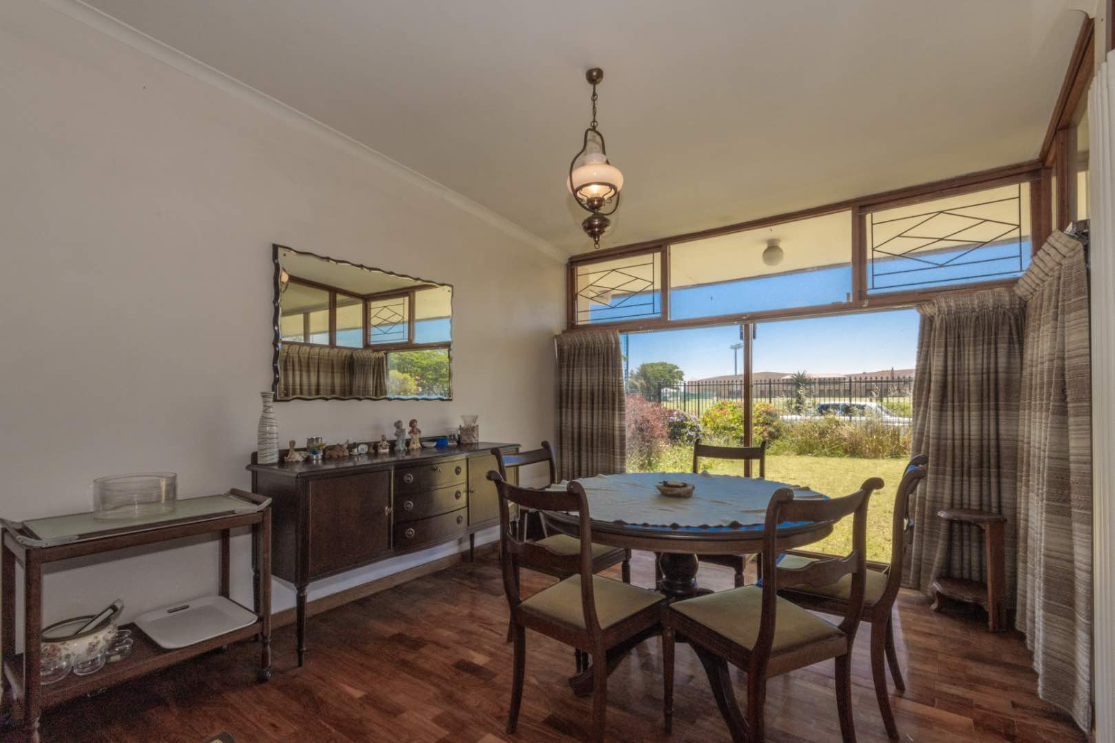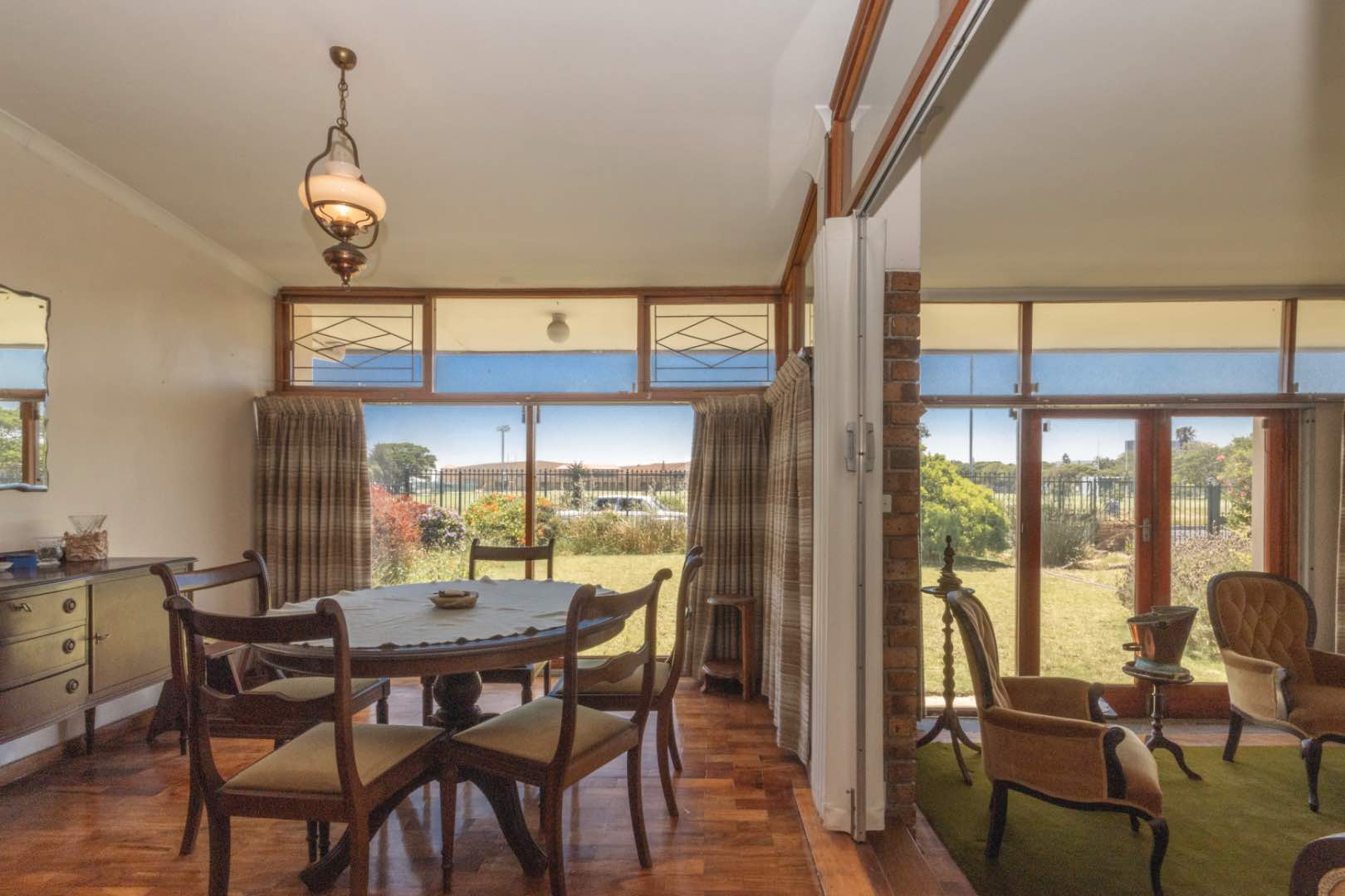 - A sizeable sunken lounge with beautiful wooden parquet flooring and a fireplace. This room opens up onto the front lawn