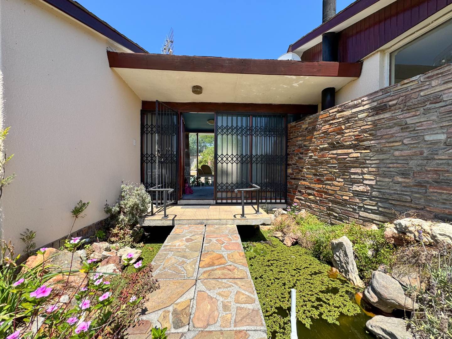 - A walkway over a water pond leading into the entrance foyer