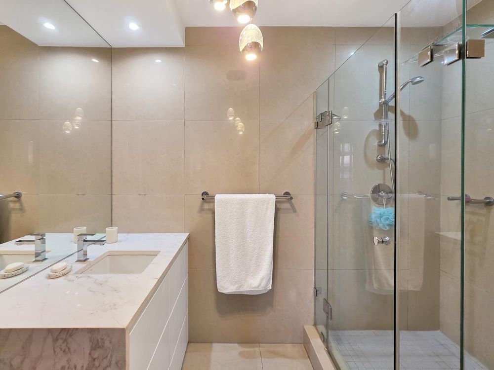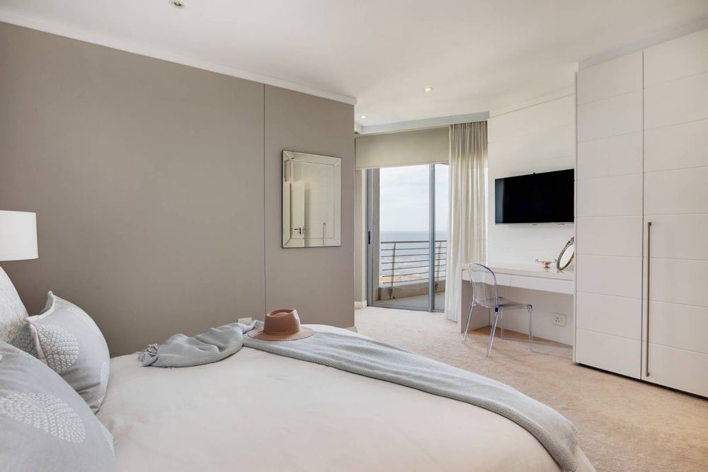 The main bedroom and bathroom are exceptionally large and have ample cupboard space. This bedroom has both views of the mountain and the sea.