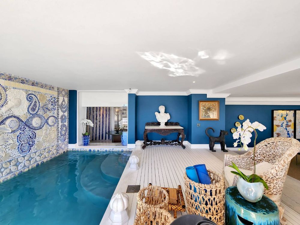 The open-plan design includes an elegant dining room and lounge that lead onto the entertainment patio, creating a harmonious space for hosting guests. Adjacent to this area is a sunny indoor pool, perfect for relaxation or yoga, adorned with an exquisite mosaic wall art.
