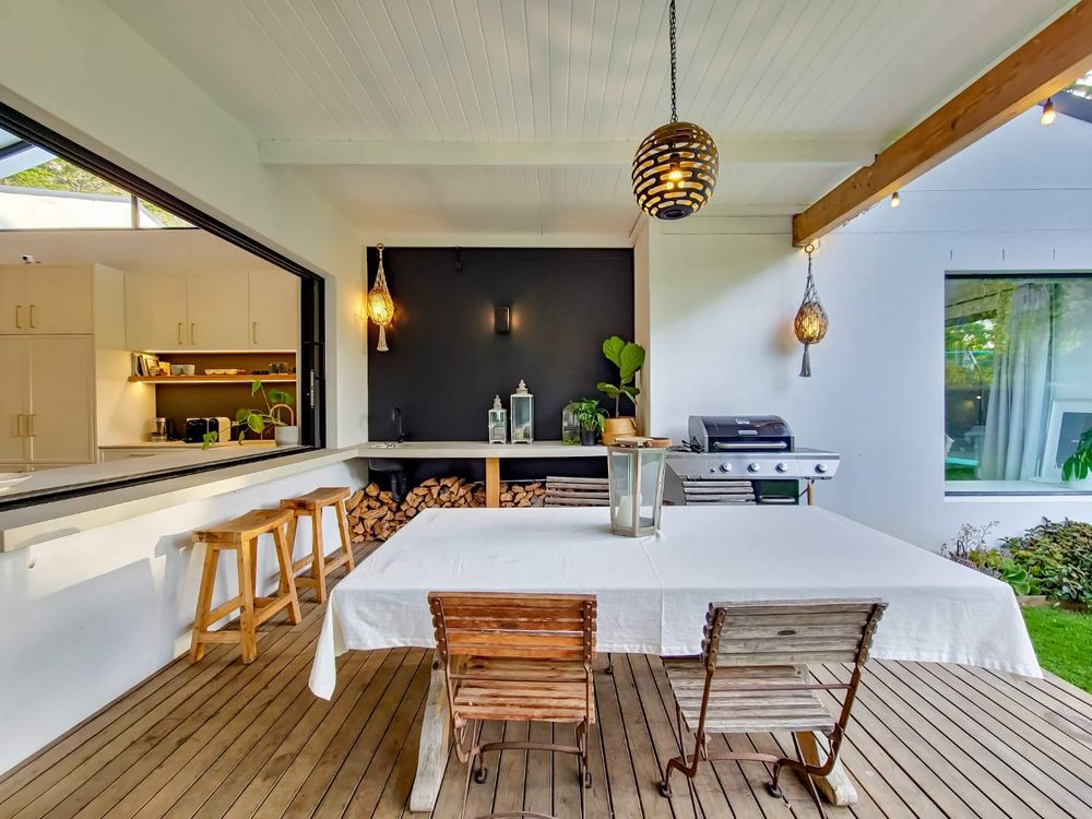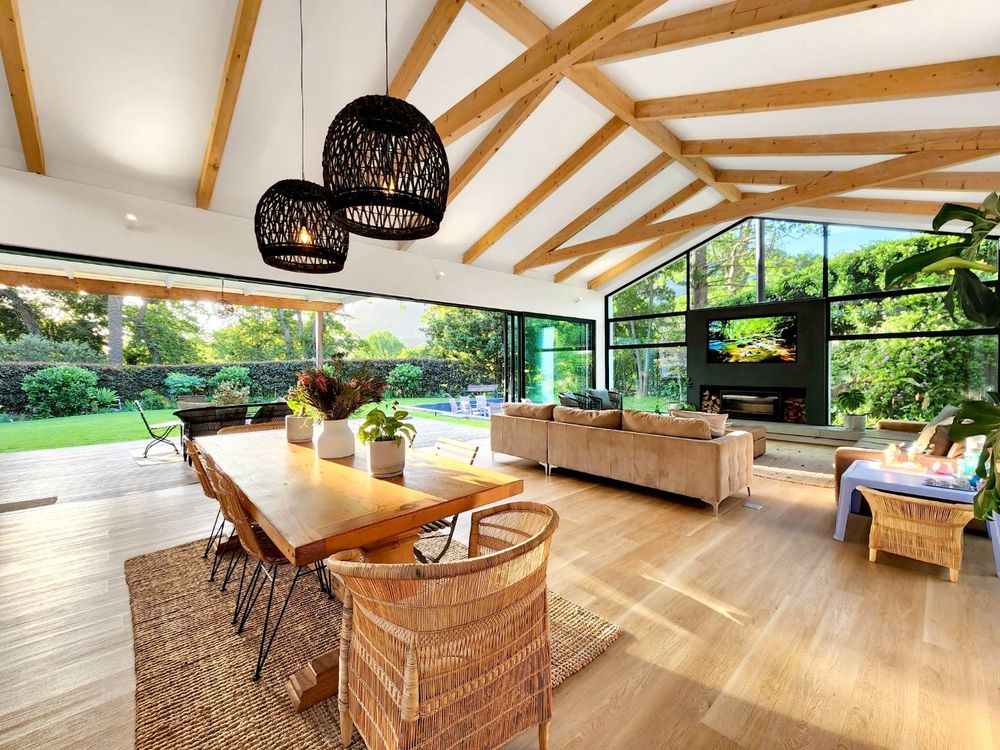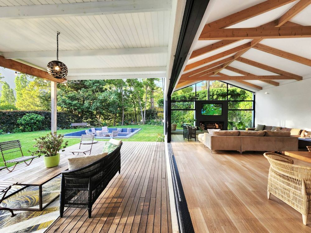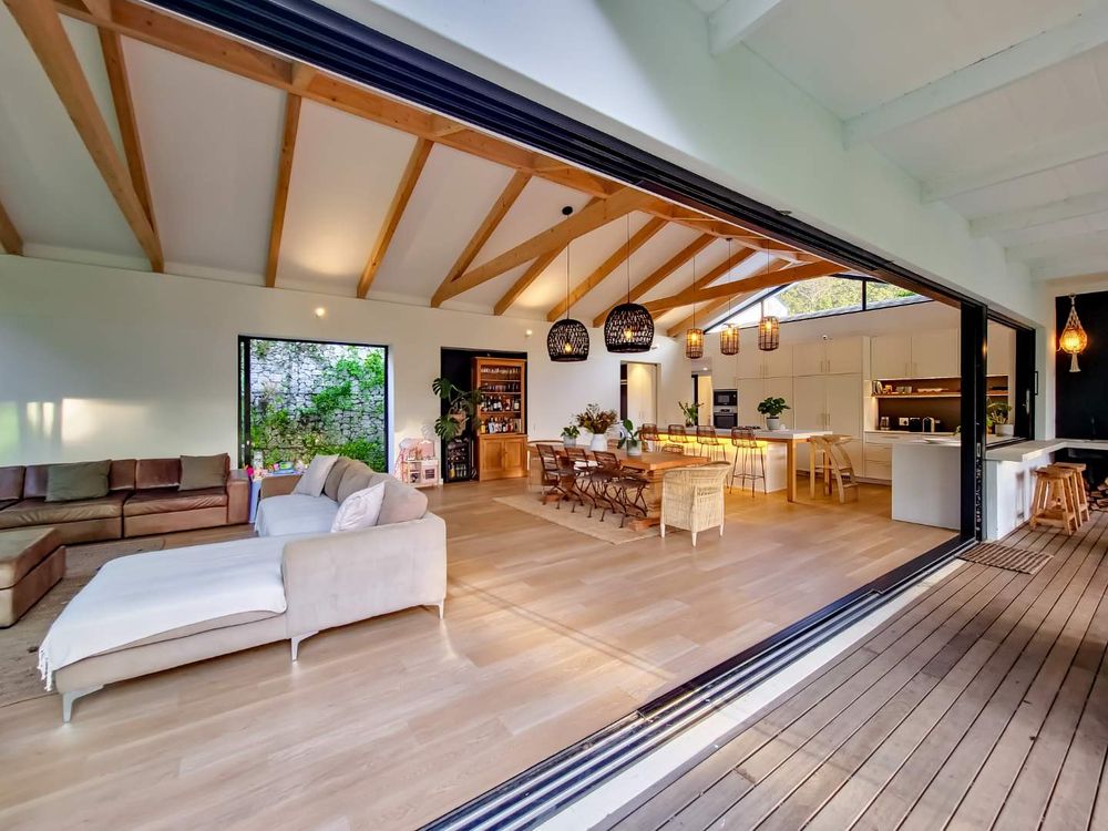 Expansive living area with vaulted ceilings, exposed spruce beams, a wall of sliding doors which stack back completely, leading to a spacious 60sqm covered patio. The garden is irrigated (borehole and rainwater tanks), well established with designer sunken conversation / firepit, features massive natural granite gabions and indigenous framing flowerbeds.