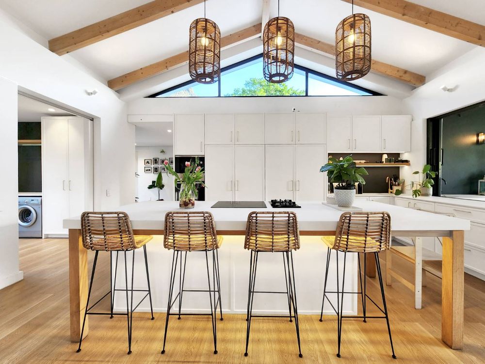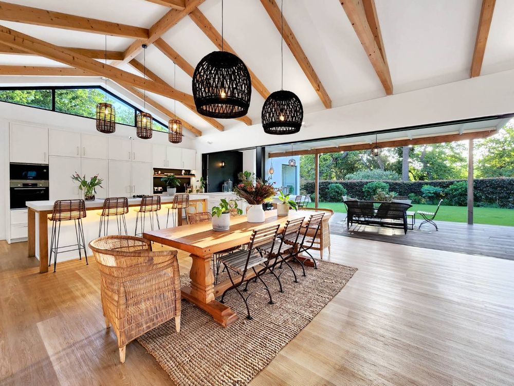Timeless open-plan kitchen has integrated appliances and a large scullery/utility area, with cavity sliders.