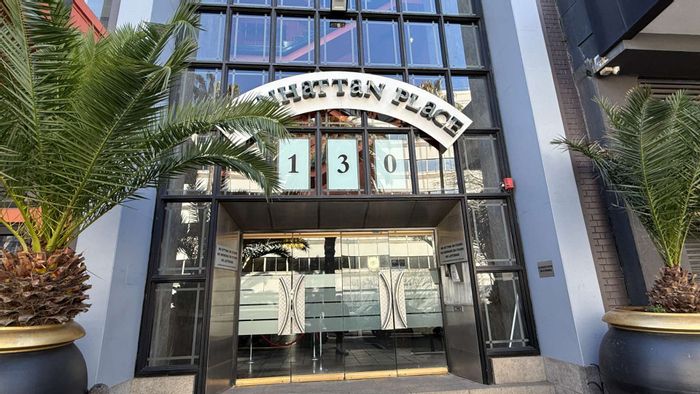 Creative two-level office in iconic Mandela Rhodes Place, centered on an animated atrium with cafés and hotel reception; linked open-plan shells (642 m²) lead to a sun‑splashed poolside patio.
