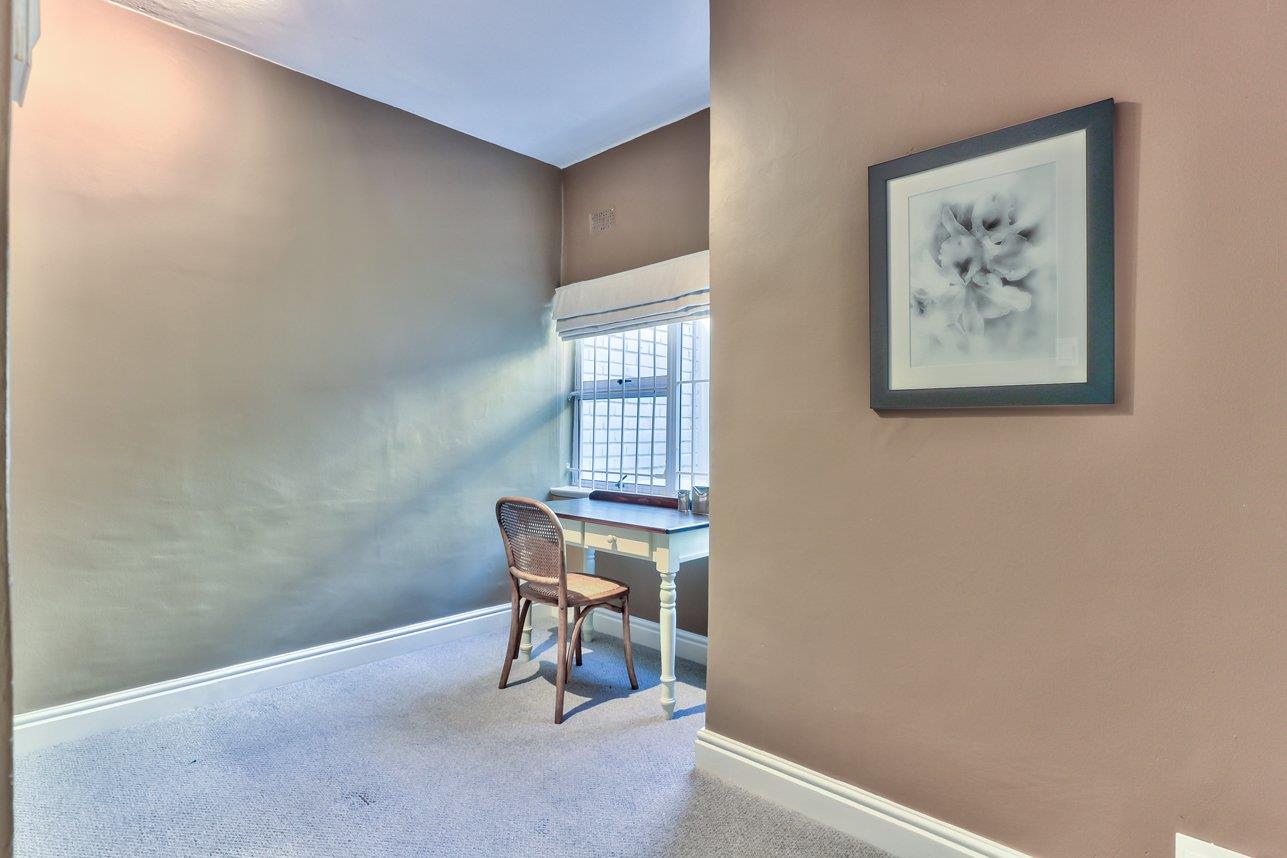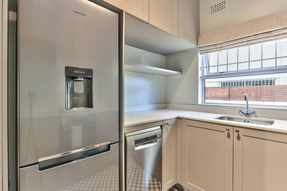 A comfortable living space opens out to a light and bright outside courtyard area, an ideal place for a small braai. A most tasteful kitchen with beautiful carpentry and stylish design. The Kitchen boasts ample storage as well as integrated space for all appliances, including a Bosch washing machine, tumble dryer, a dishwasher, fridge/freezer add to that a gas stove