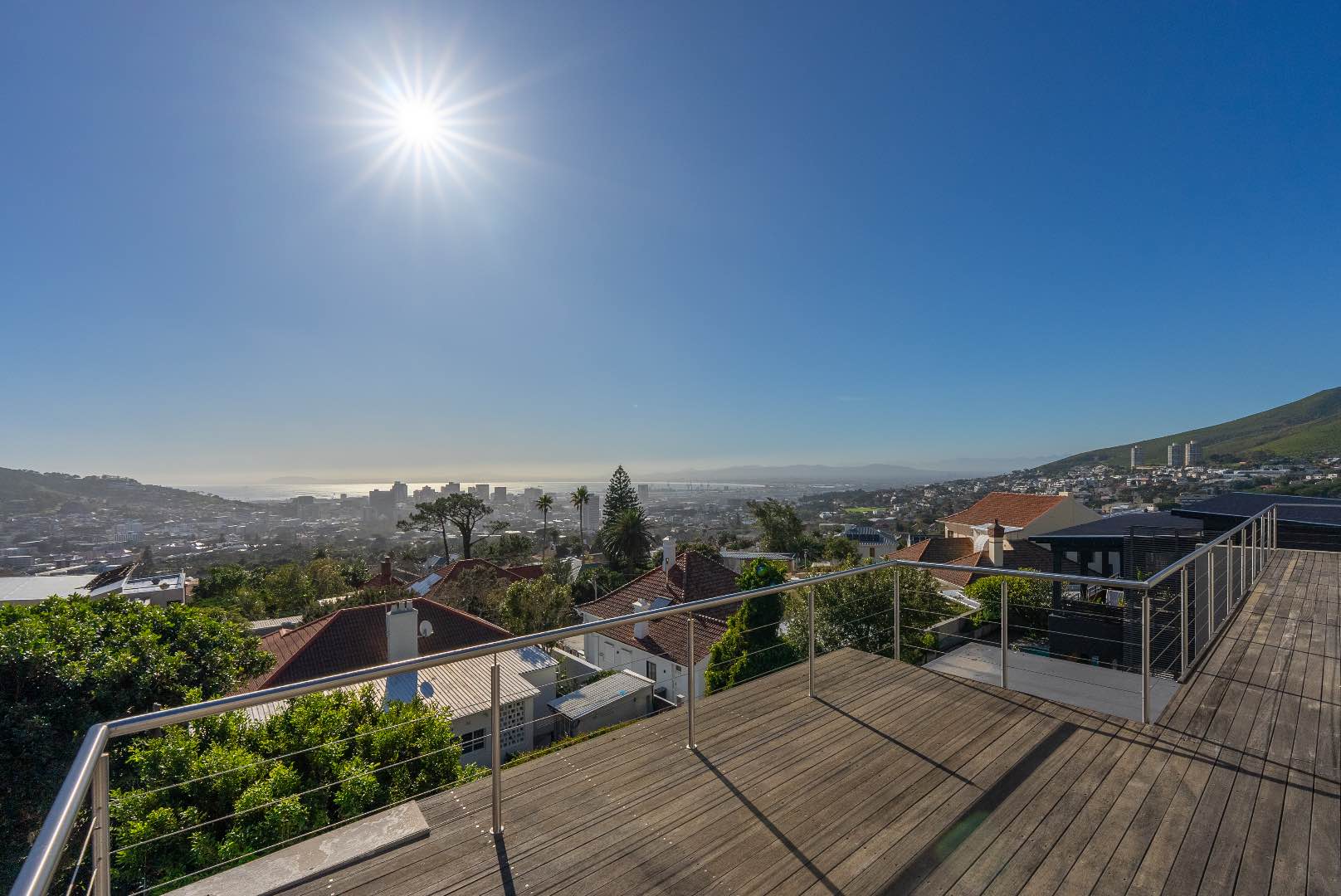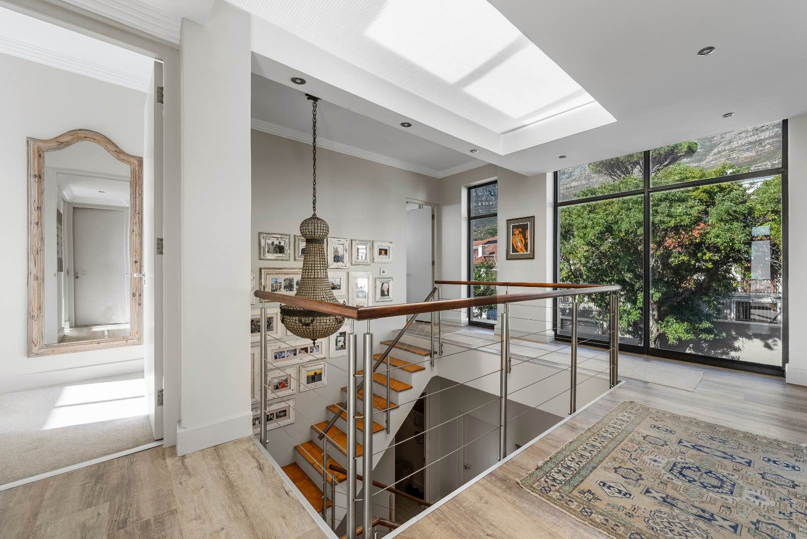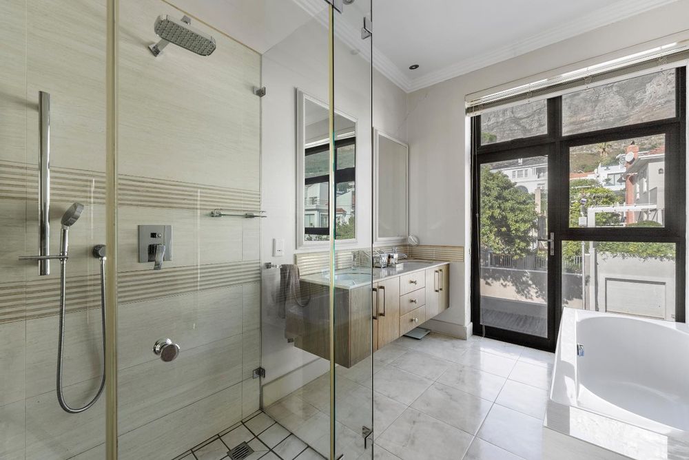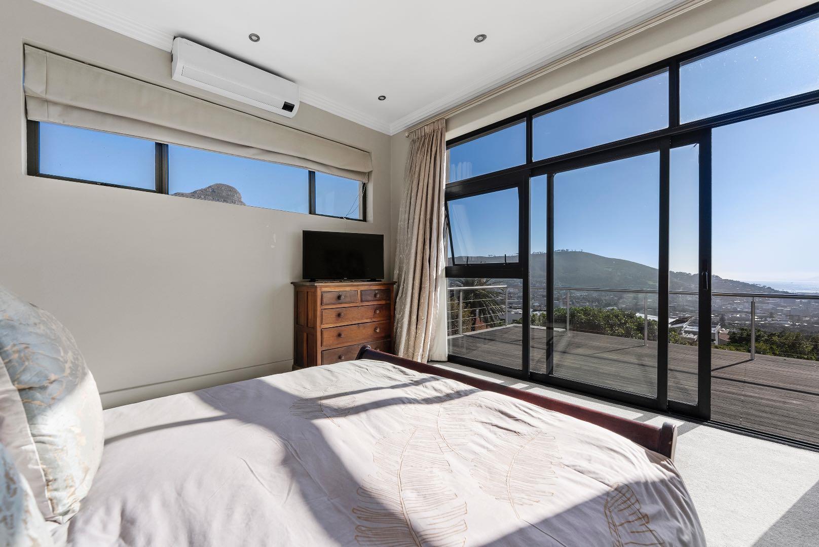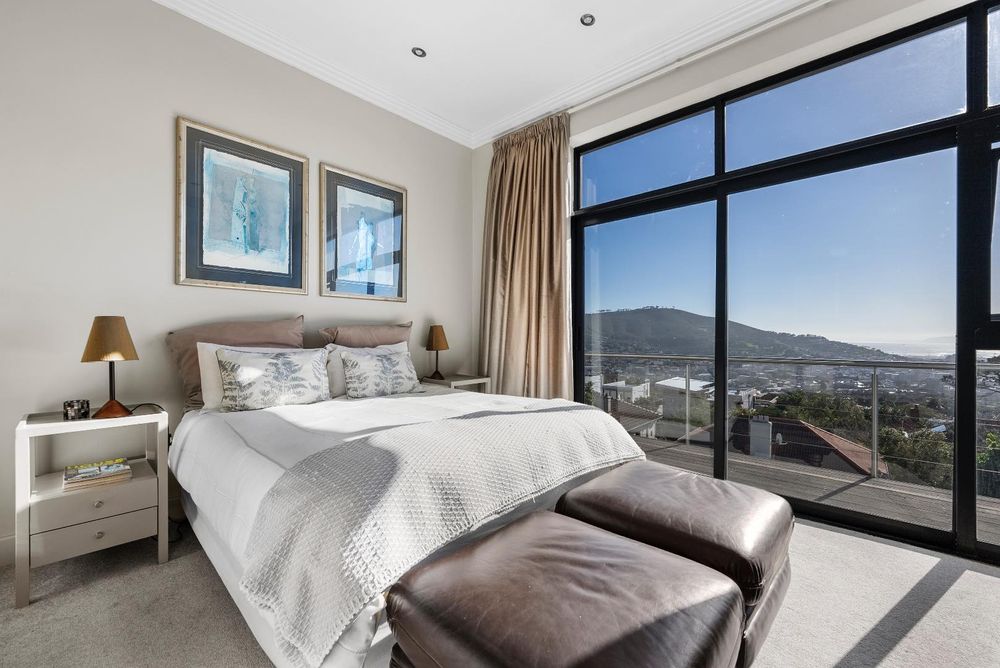 Upstairs, the home features 4 bedrooms and 3 bathrooms. Each bedroom offers either beautiful Table Mountain views or Lion’s Head, Signal Hill and city/ harbour views. The main bedroom is a luxurious retreat, showcasing a spacious walk-in dressing room, en-suite bathroom, and a patio with panoramic views.