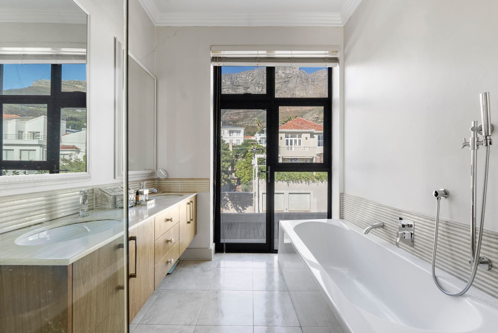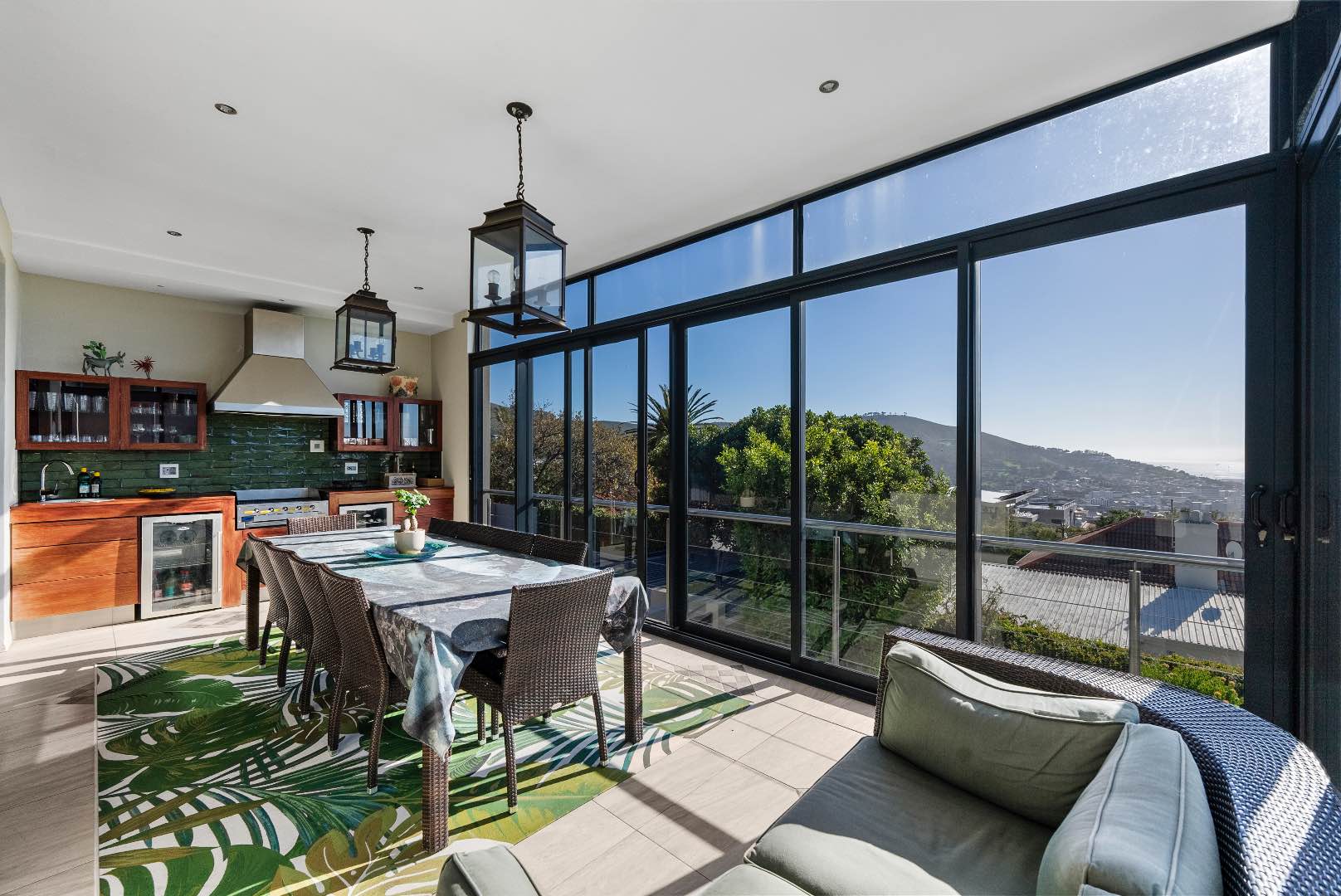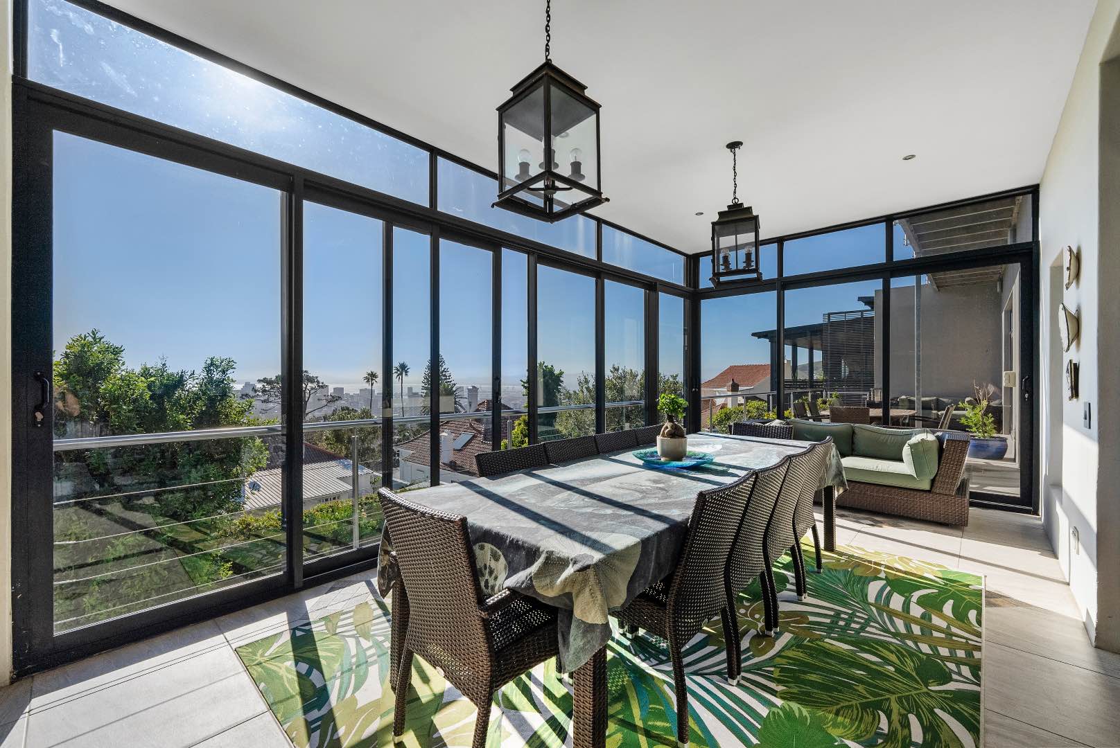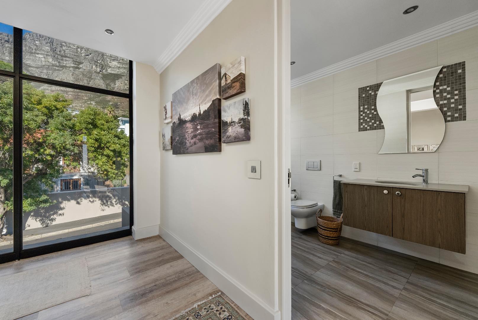 Upstairs, the home features 4 bedrooms and 3 bathrooms. Each bedroom offers either beautiful Table Mountain views or Lion’s Head, Signal Hill and city/ harbour views. The main bedroom is a luxurious retreat, showcasing a spacious walk-in dressing room, en-suite bathroom, and a patio with panoramic views.