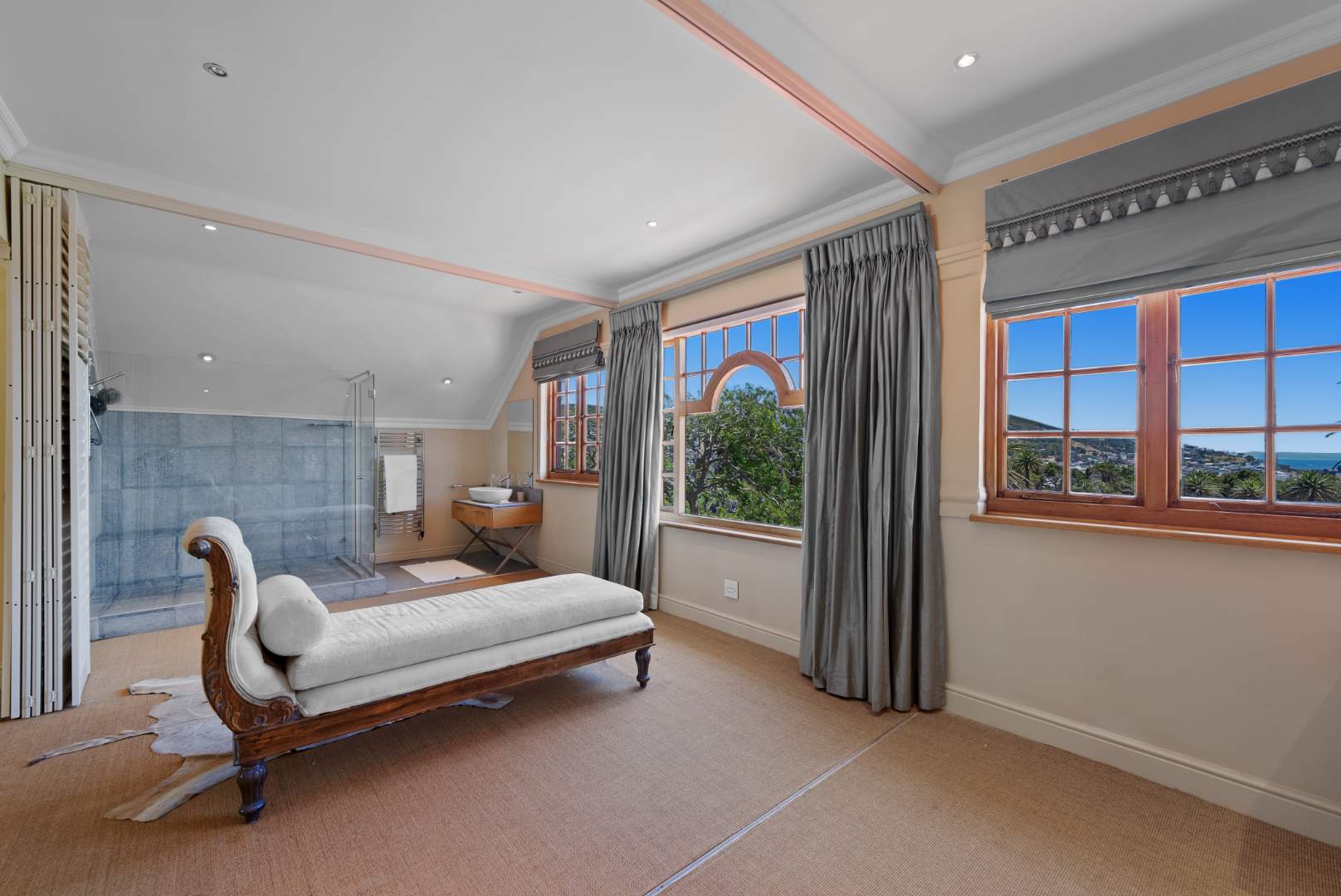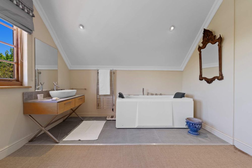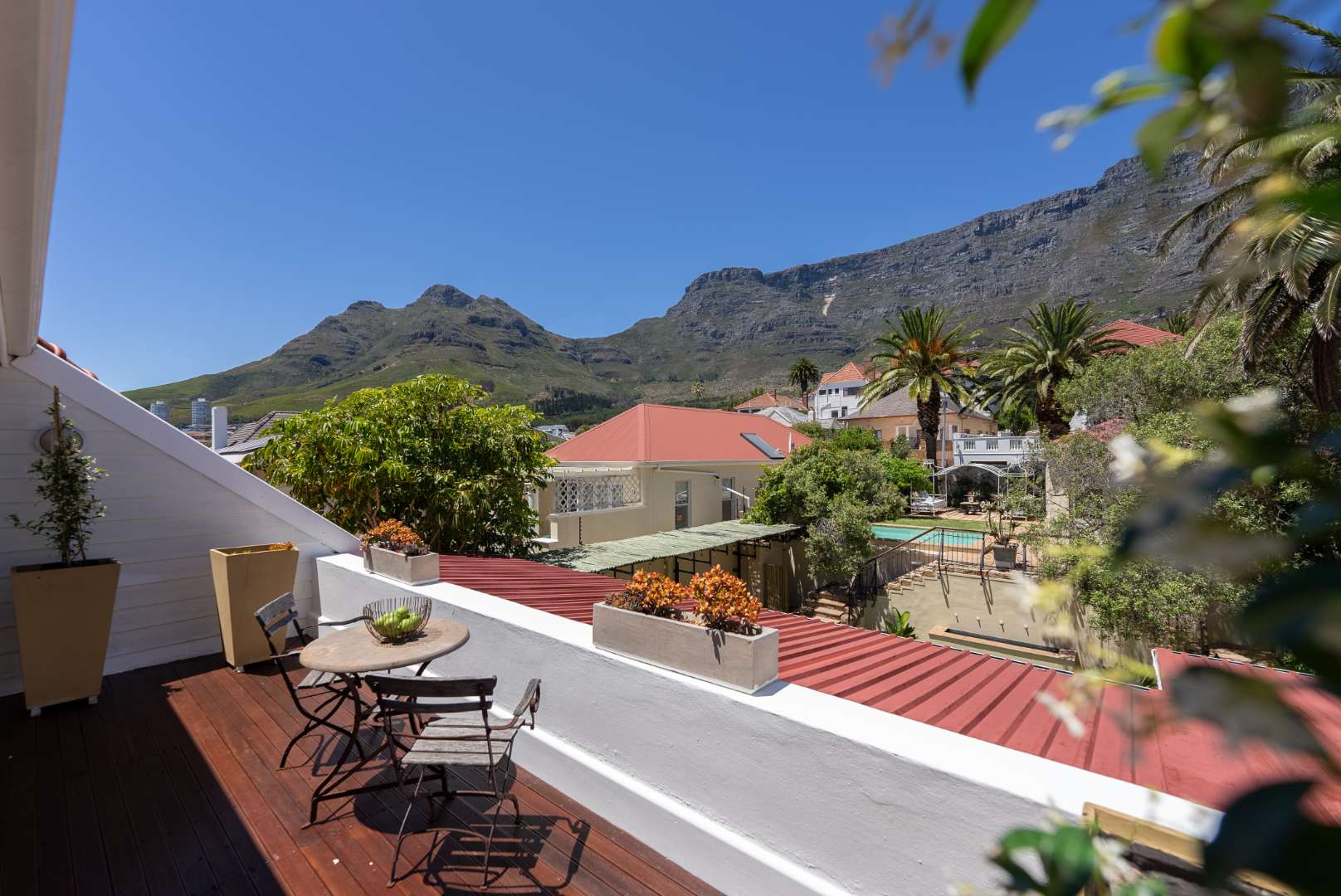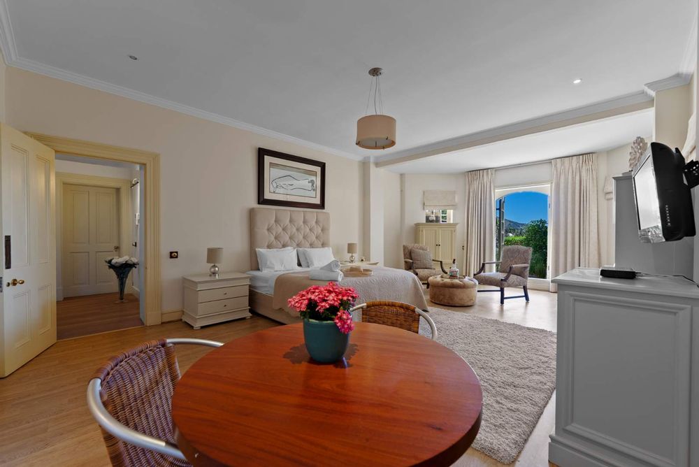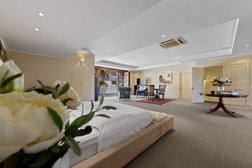 Four bedrooms feature en-suite bathrooms, with most offering walk-in closets and additional cupboard space. The top floor is dedicated to the luxurious main suite, elegantly designed with wooden stack shutters and a private balcony boasting breathtaking views of Table Mountain.