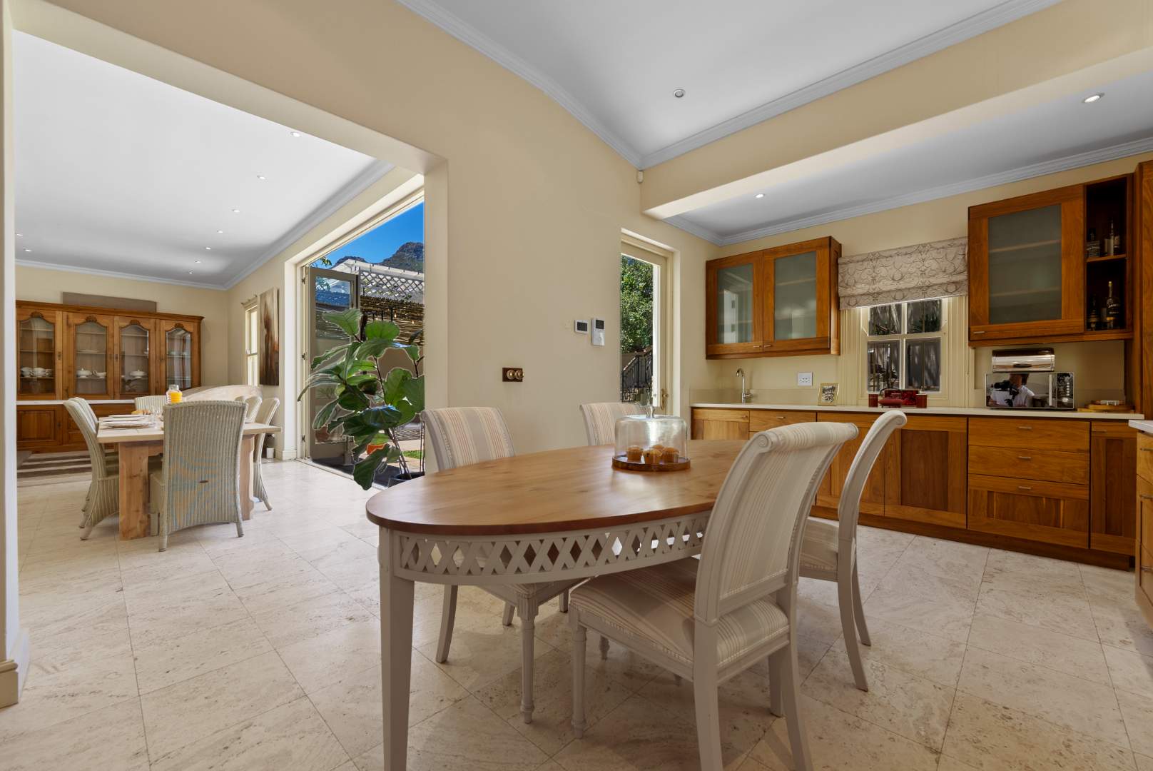 From the 2 front sumptuous reception rooms on the middle level with large sash/bay original windows and original fireplace, you have wonderful vistas over the reservoir and beyond. The formal dining area features a cozy wood-burning fireplace, creating an inviting ambiance. The expansive kitchen seamlessly extends through large stackable doors, flooding the space with natural sunlight and opening onto an entertainment patio and pool area with breathtaking views of Table Mountain. A discreetly tucked-away scullery ensures a clutter-free space, while this level also boasts a spacious and welcoming study. Additionally, one or two-bedroom suites can be configured to suit your needs.