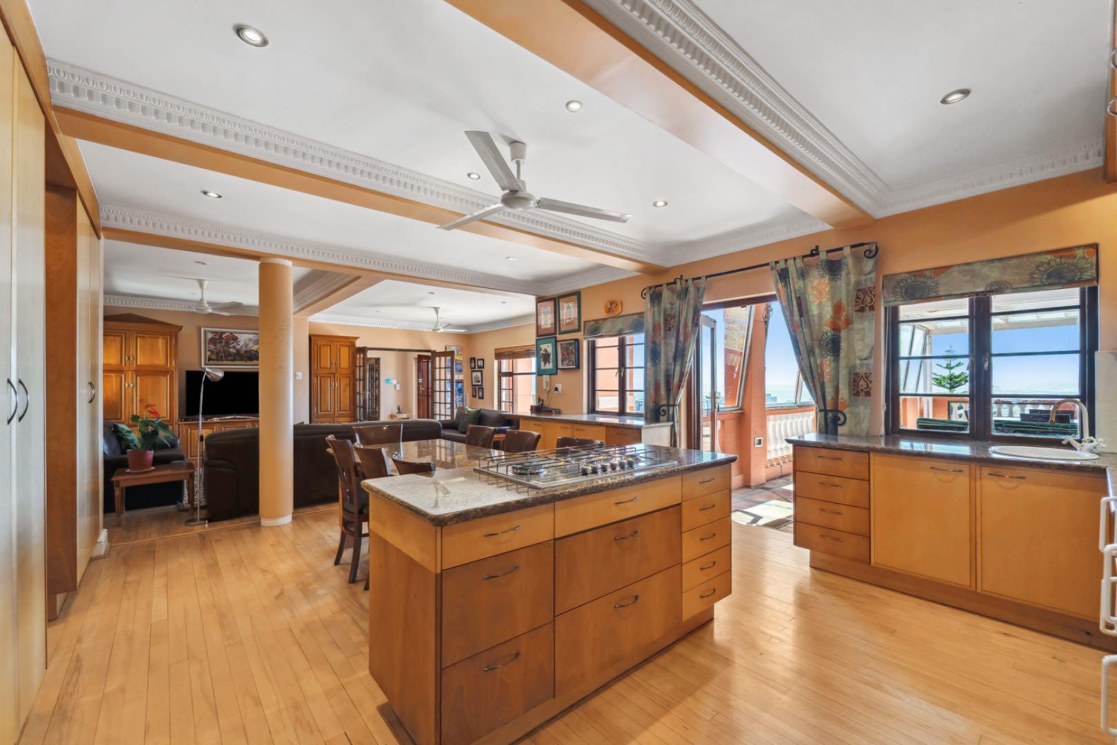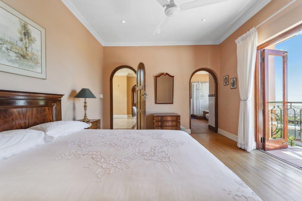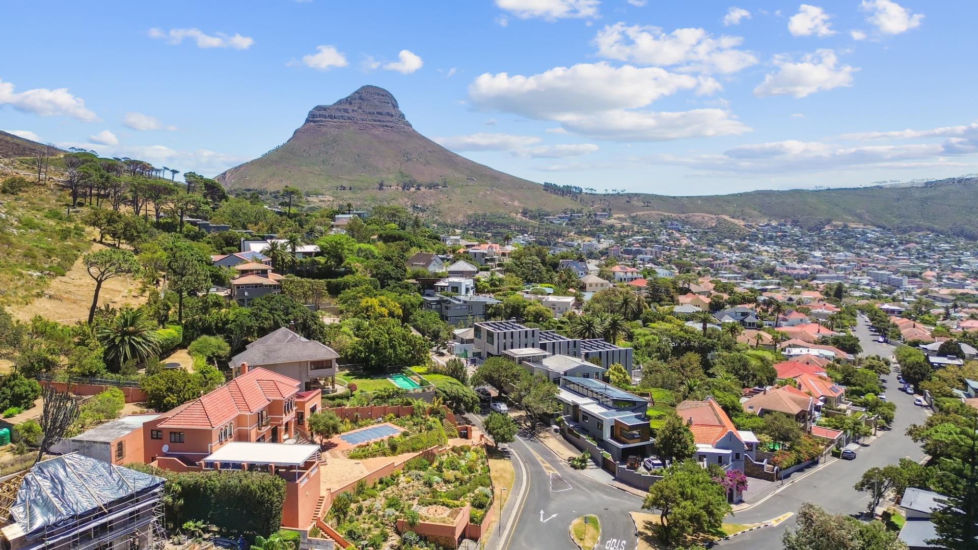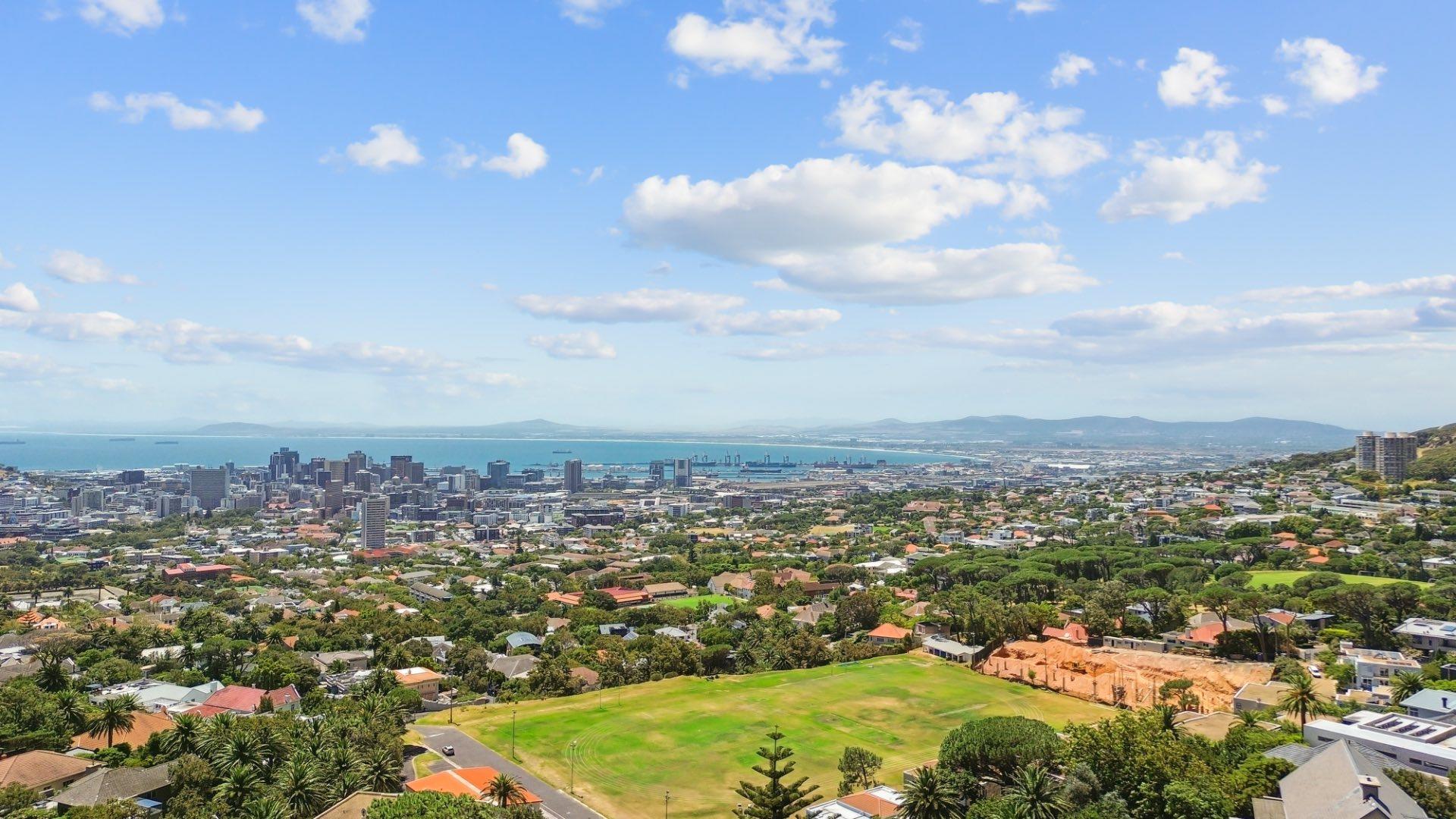 Upstairs, two generous bedrooms share a Jack & Jill bathroom, while the luxurious ensuite primary bedroom offers a dressing room and unparalleled vistas. Descending to the lower level reveals a versatile space that can function as a gym, entertainment area, complete with a guest bedroom and ensuite bathroom. The large living room opens to the pool area, delivering panoramic views of the city, harbour, Signal Hill, Lion’s Head and Table Mountain as your back drop. The property also boasts a large tiered garden with indigenous flora, creating a tranquil oasis in the heart of the city. With five garages—three at the top with direct access to the house and two at street level—convenience is a hallmark of this home. There is also a domestic suite.