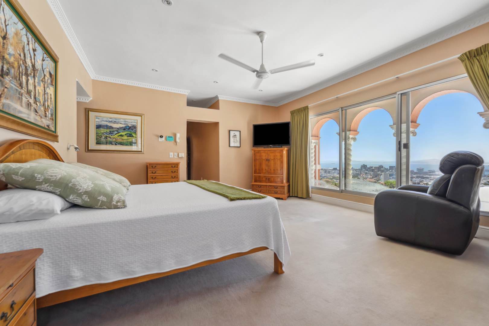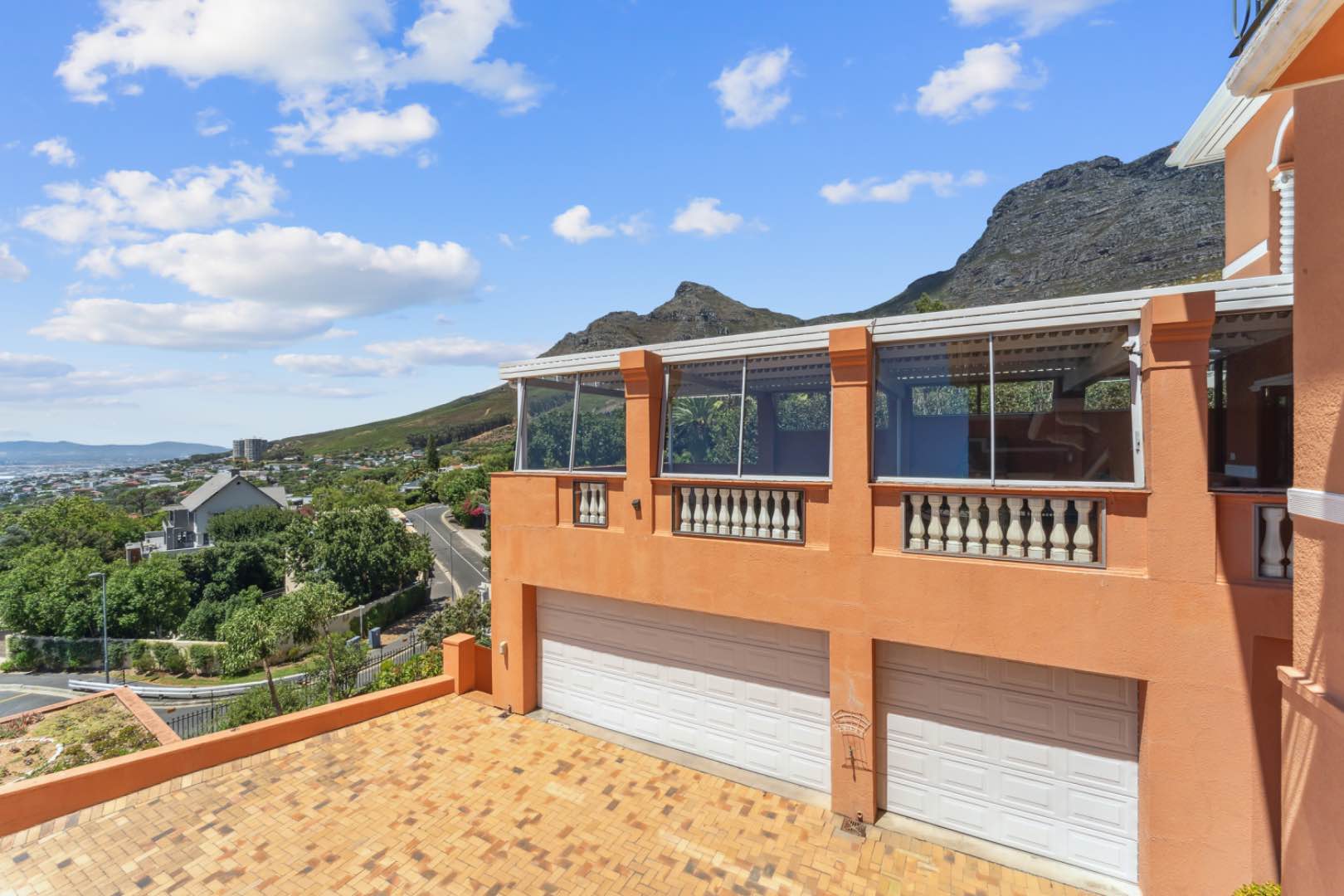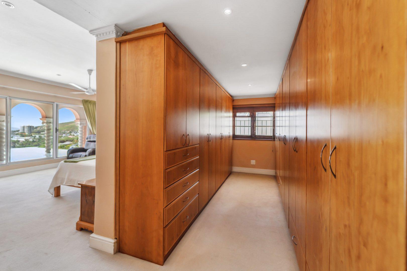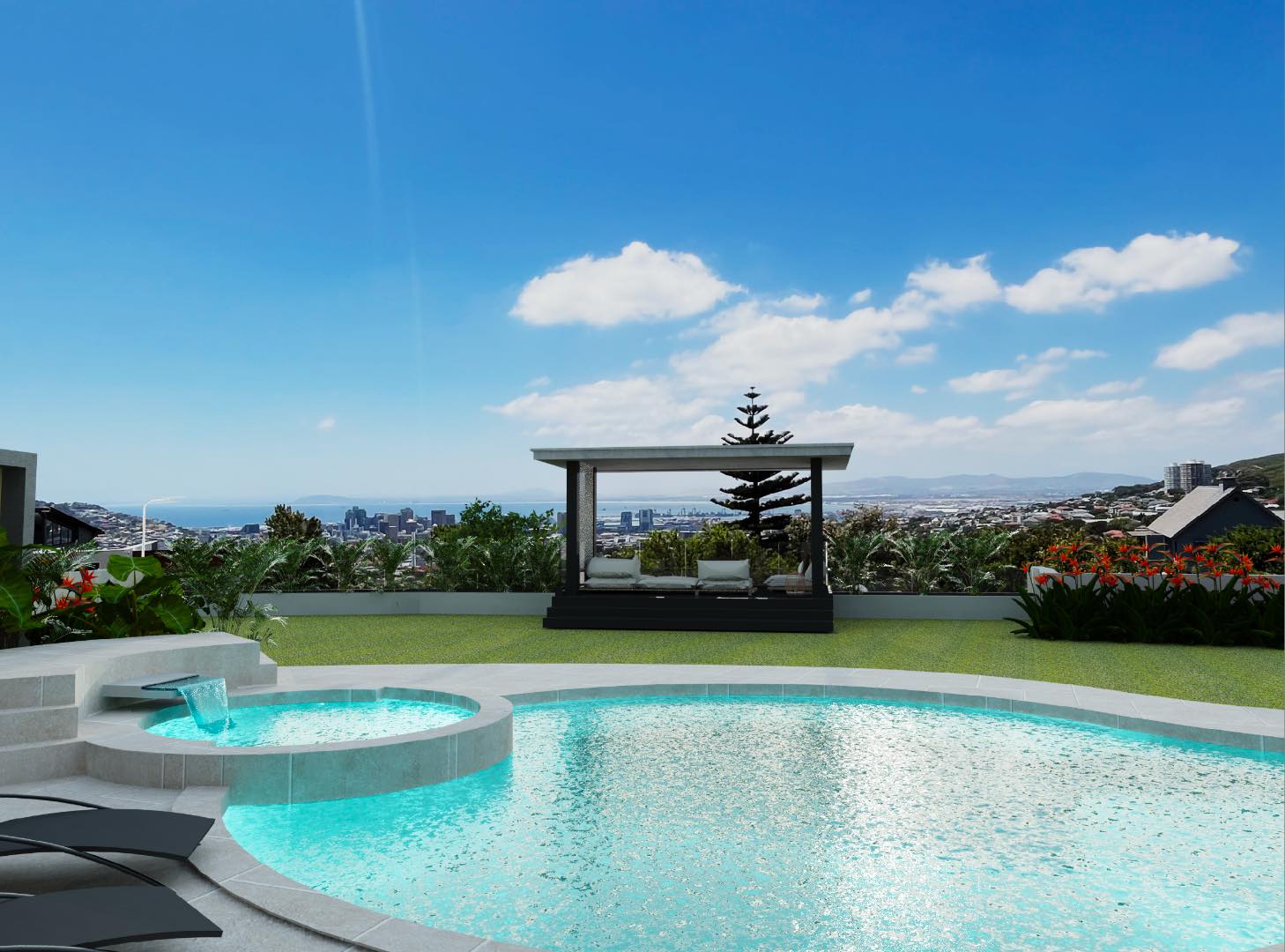 Upstairs, two generous bedrooms share a Jack & Jill bathroom, while the luxurious ensuite primary bedroom offers a dressing room and unparalleled vistas. Descending to the lower level reveals a versatile space that can function as a gym, entertainment area, complete with a guest bedroom and ensuite bathroom. The large living room opens to the pool area, delivering panoramic views of the city, harbour, Signal Hill, Lion’s Head and Table Mountain as your back drop. The property also boasts a large tiered garden with indigenous flora, creating a tranquil oasis in the heart of the city. With five garages—three at the top with direct access to the house and two at street level—convenience is a hallmark of this home. There is also a domestic suite.