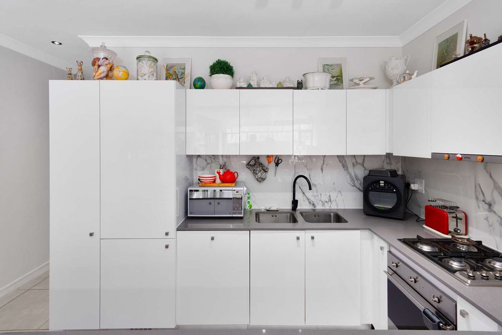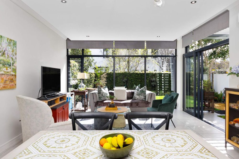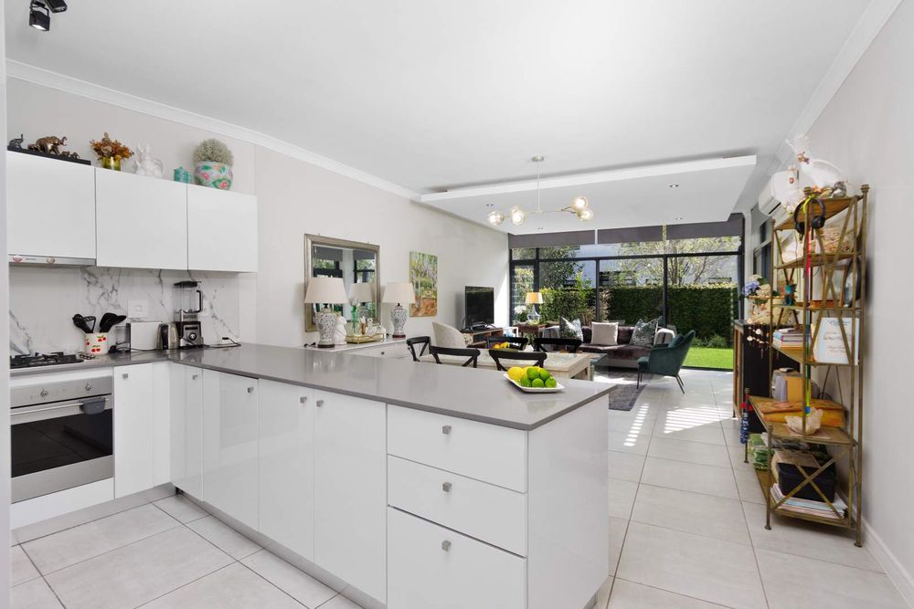 The open-plan kitchen features Caesarstone counters and integrated Smeg appliances, including a fridge, dishwasher, and washer/dryer dual purpose.