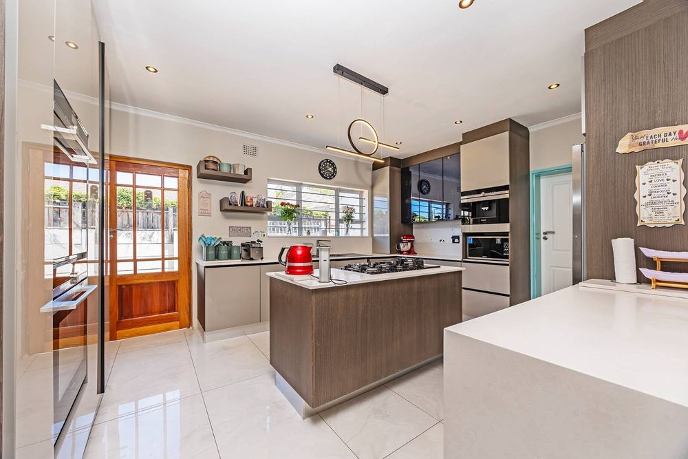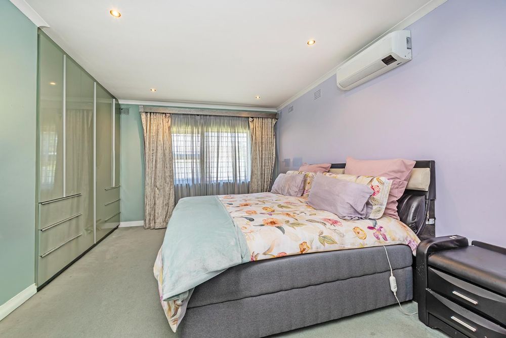 The remainder of the home offers four well-sized bedrooms, all finished with vinyl flooring and fitted with burglar bars for added security. The bathrooms are tastefully renovated with clean, modern finishes, while the main suite also enjoys the added comfort of air-conditioning and a private dressing room.