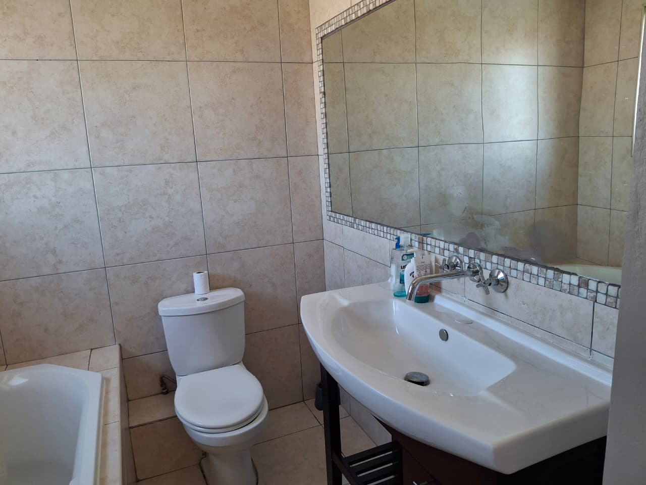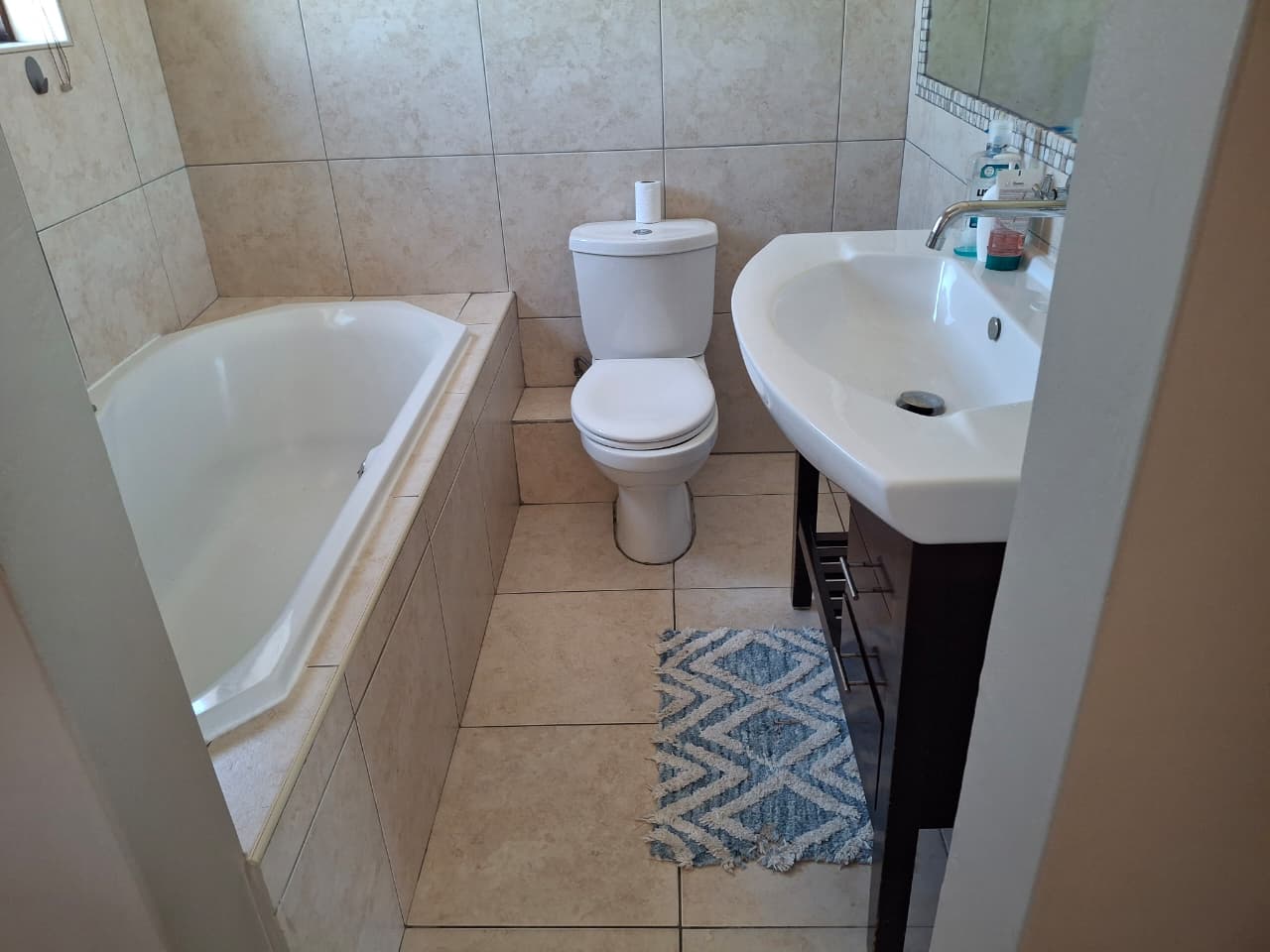 Upstairs consists of 3 bedrooms. The Main bedroom has an en-suite with a bath. The 2nd bathroom has a shower, toilet and basin.