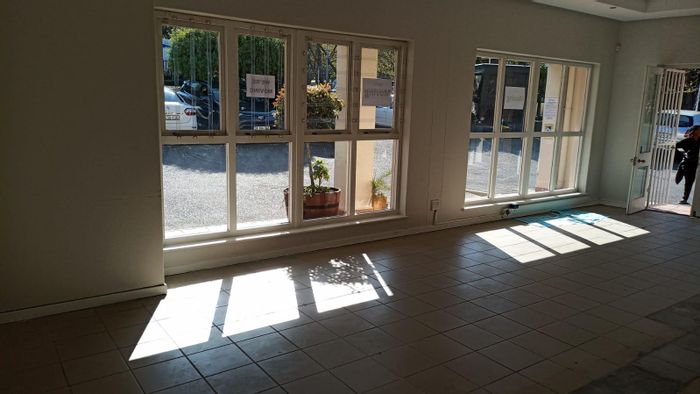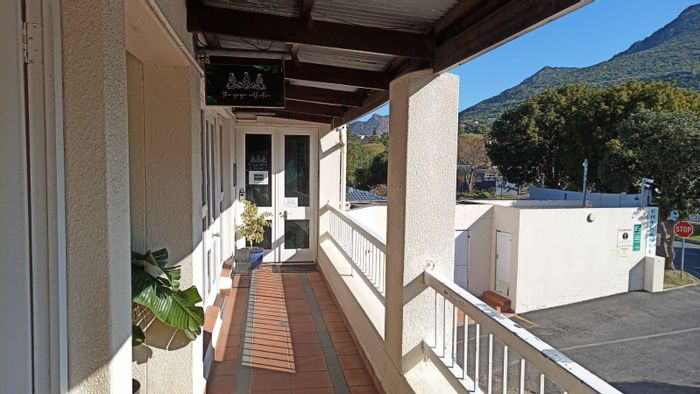 High-visibility corner retail unit in central Hout Bay, ideal for client-facing businesses — modern, naturally lit 47m² first-floor space with solar backup, kitchenette, AC and ample parking.