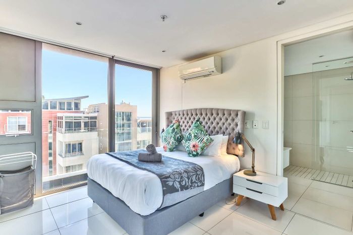 Elevated city living with panoramic Table Mountain-to-ocean views in De Waterkant — fully furnished 10th-floor apartment with wraparound balcony, pool access and secure underground parking.