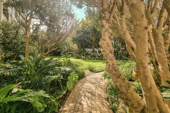 Relaxed garden-side living on the ground floor with Zimbabwe teak flooring, access to large communal gardens, a well-equipped kitchen and secure parking — one bedroom, one bath.