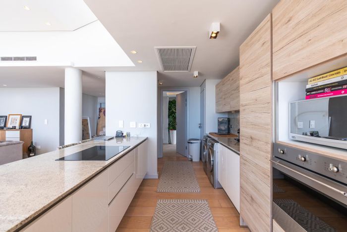 Wake up to panoramic 180-degree ocean and Table Mountain views from an open-plan apartment opposite Centre Point Shopping Centre, with pool, 24hr security, two beds, two baths, secure parking.