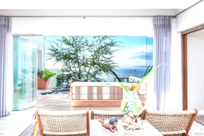 This stunning three-story home in Camps Bay features a double garage, studio apartment, open plan living area, and ocean views.