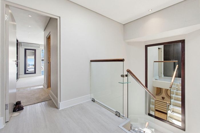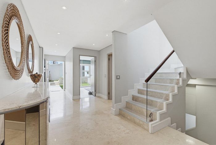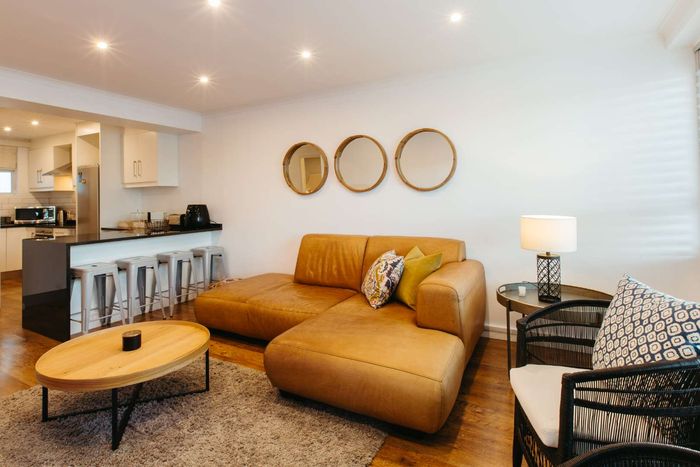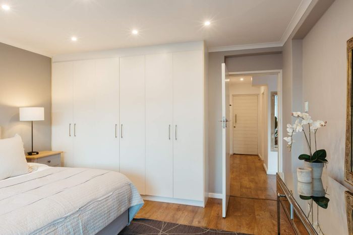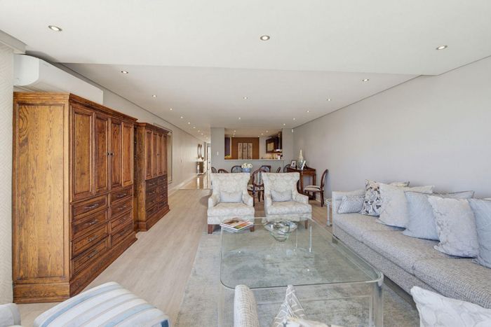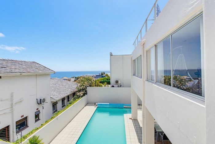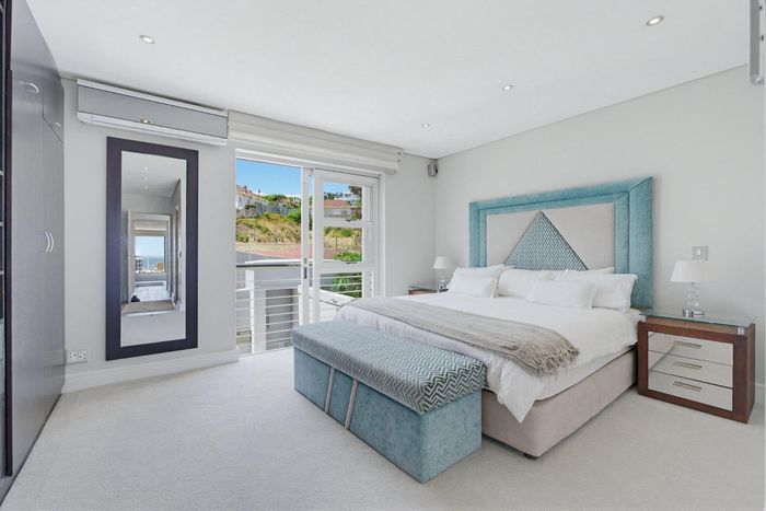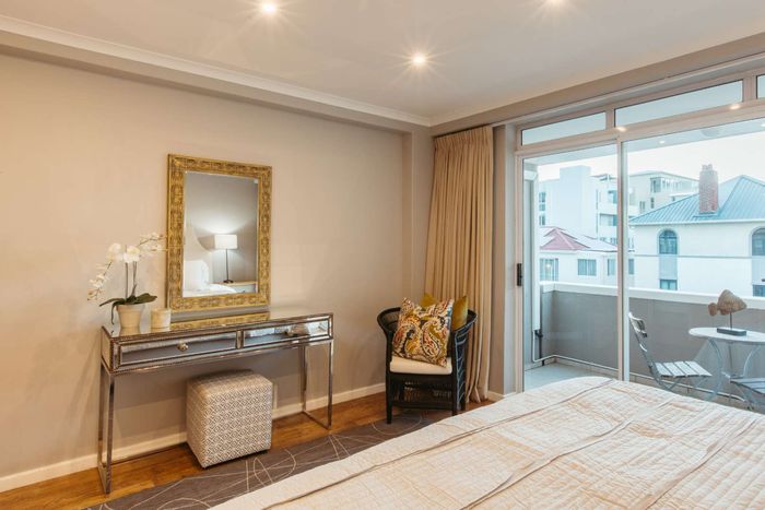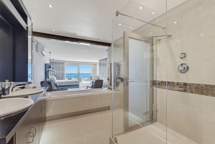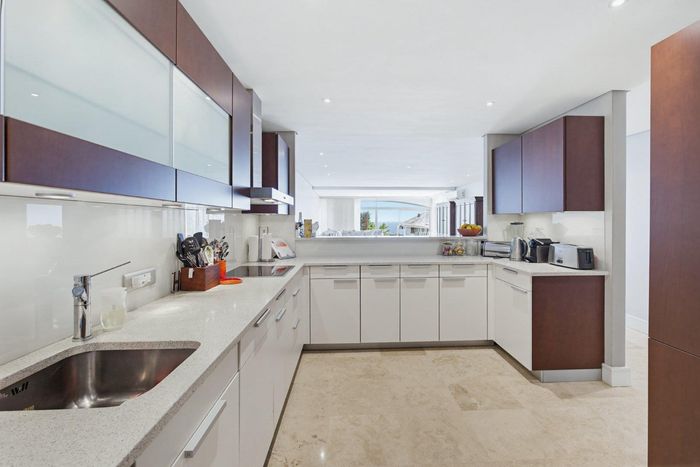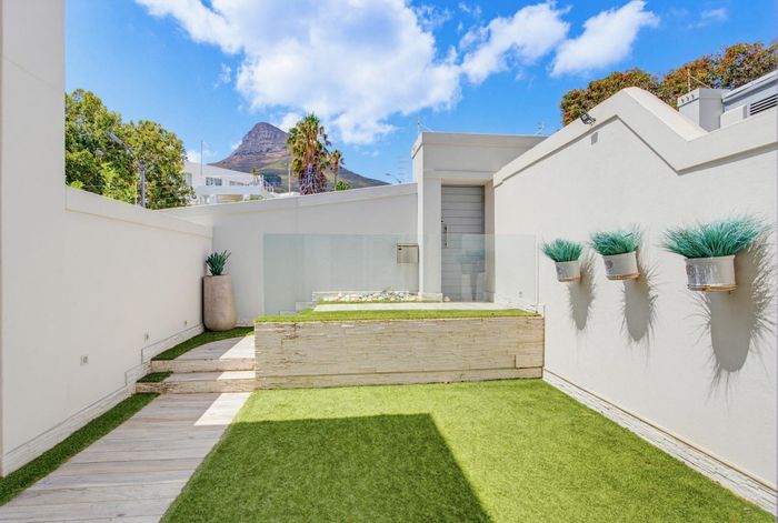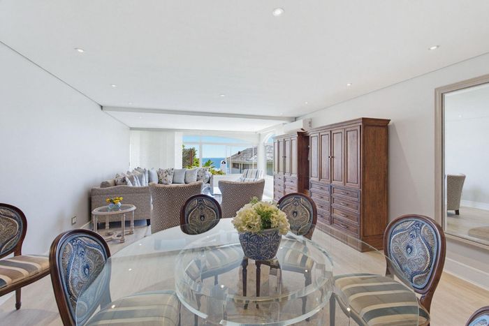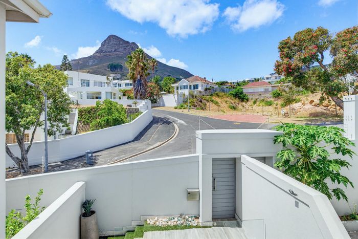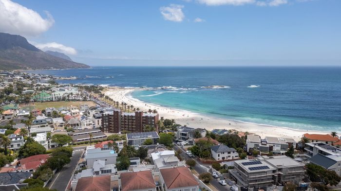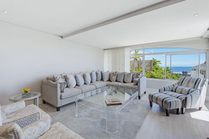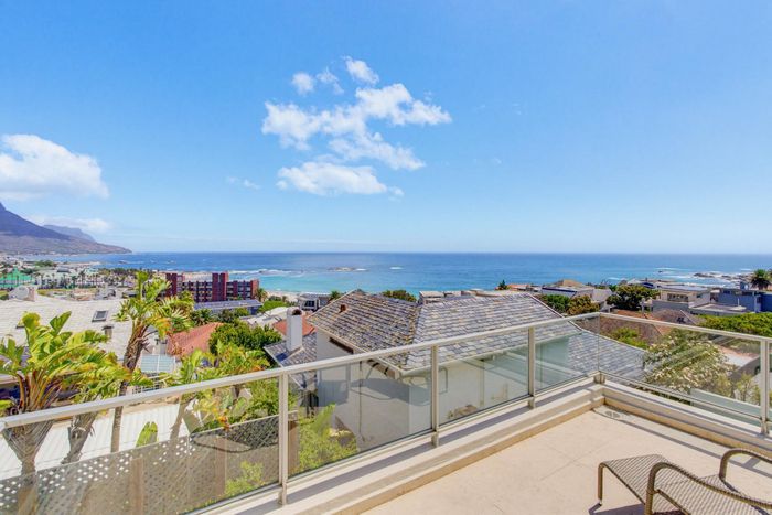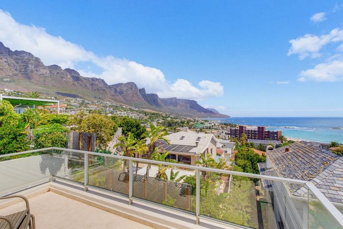 Coastal luxury living moments from Glen Beach on Camps Bay’s premier road, with panoramic ocean and mountain views, designer kitchen, private terrace and garden — three bedrooms, three baths, double garage.