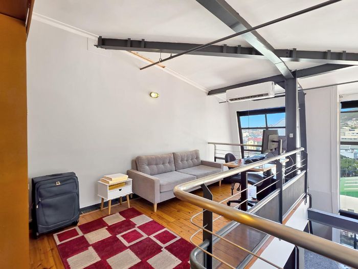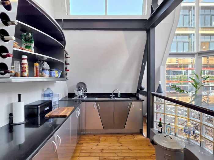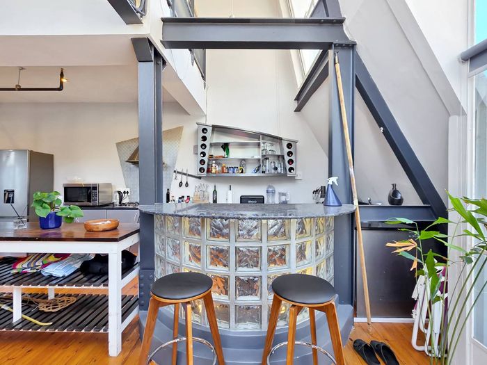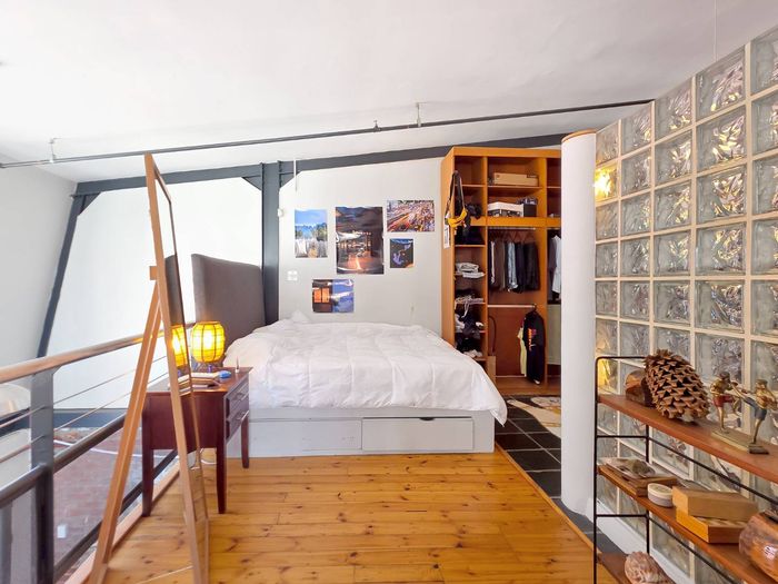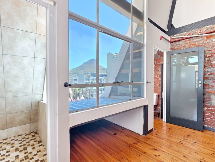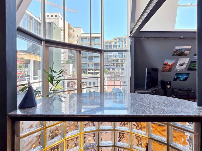 Live vibrant city life between Loop and Bree Streets, steps from Bree and Kloof's eateries. Loft-style apartment with mezzanine bedroom, terrazzo counters, balcony views of Table Mountain and Lion's Head.