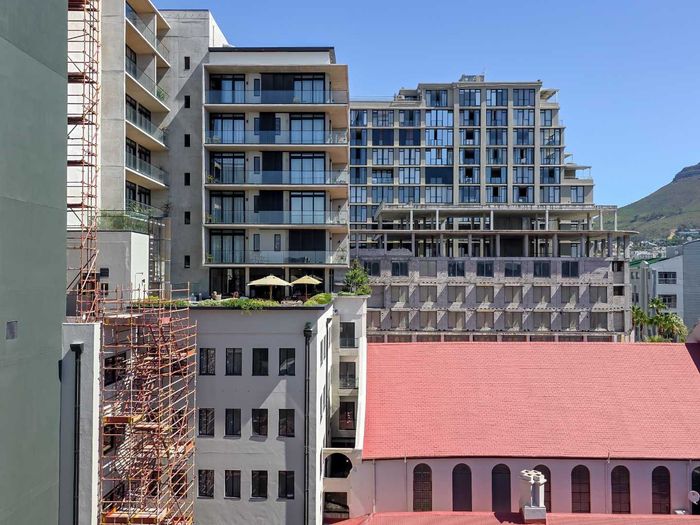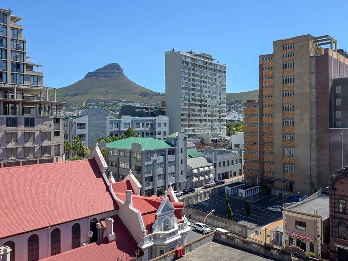 Lock-up-and-go urban living on Church Square with partial Table Mountain views; turnkey, furnished with Bosch appliances and pool access — two bedrooms, two bathrooms and secure parking.