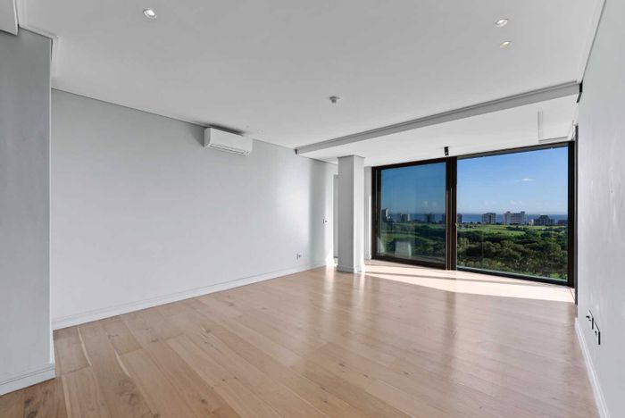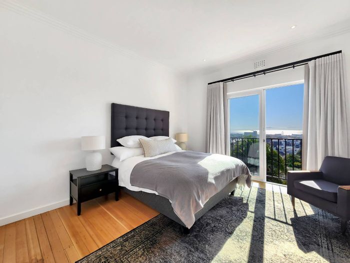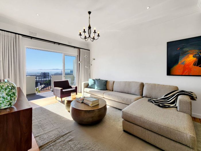 Perched high in Green Point, enjoy panoramic city and Atlantic views from a large private terrace, sunlit open-plan living, two en suite bedrooms, two secure parking bays, pool.