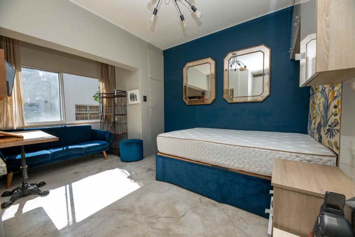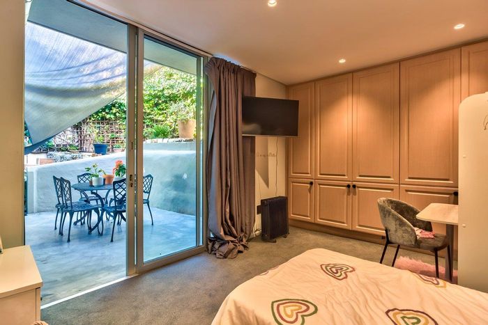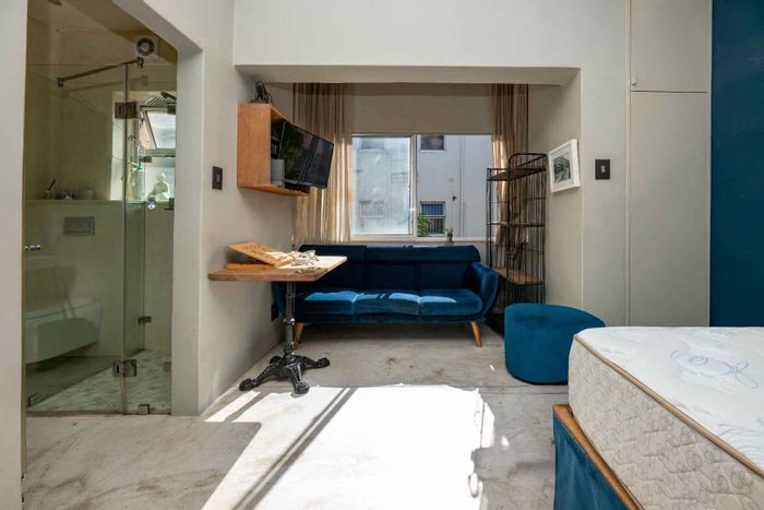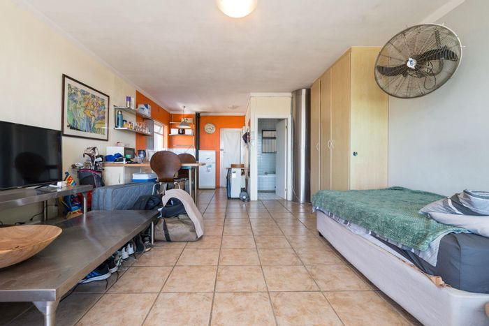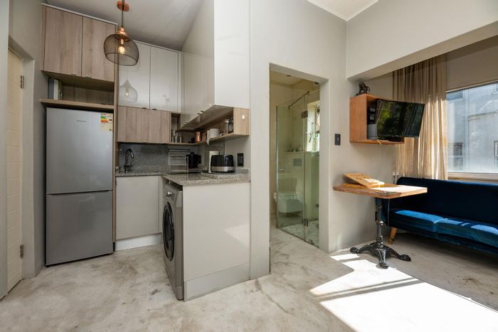 Airbnb-ready studio in Green Point near the V&A Waterfront and Sea Point promenade — bright seating area, fits a double bed, compact kitchen, prepaid electricity and secure street parking.