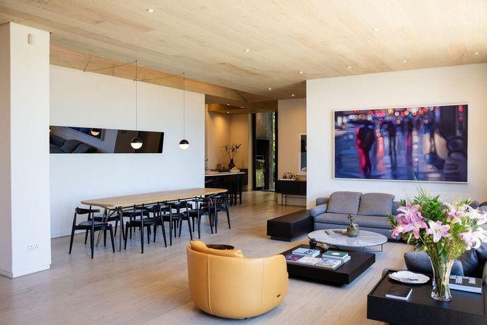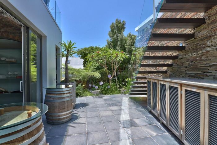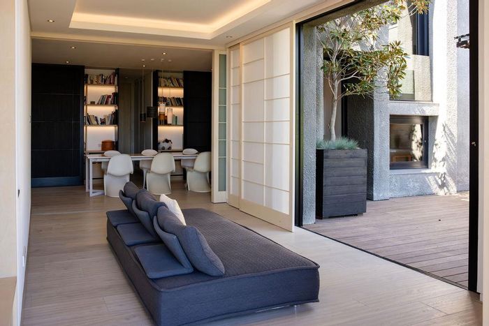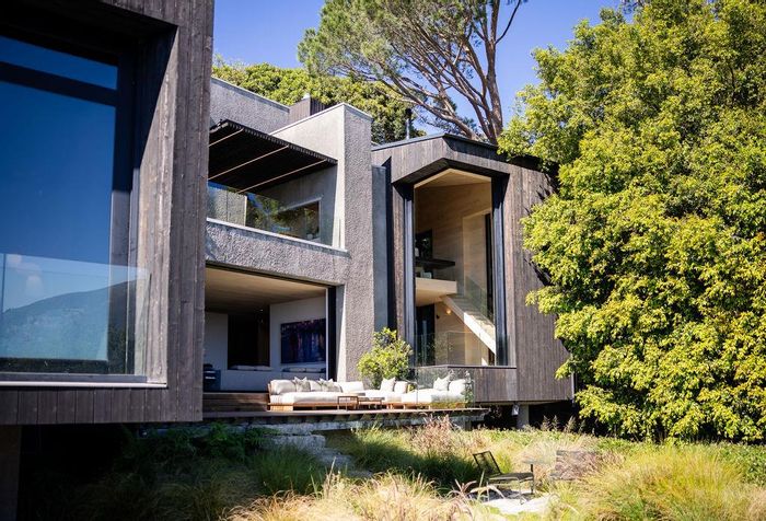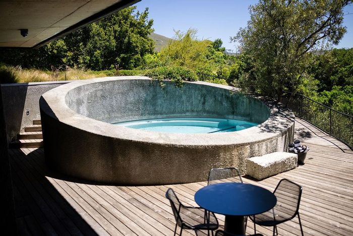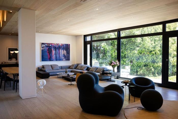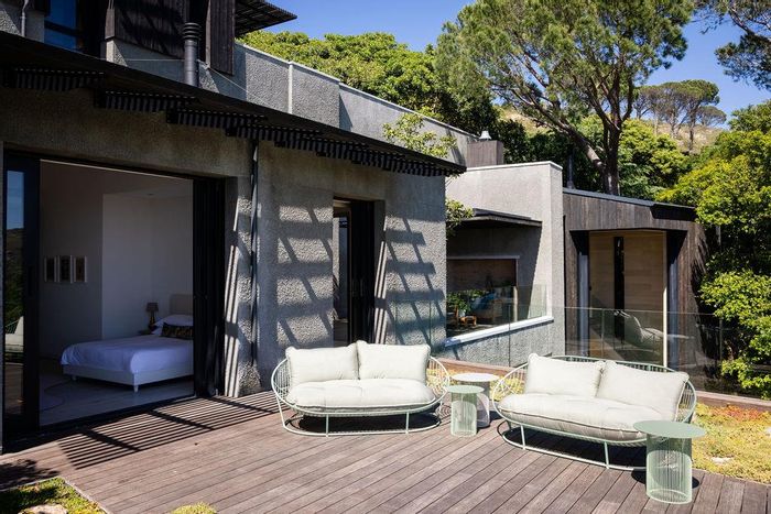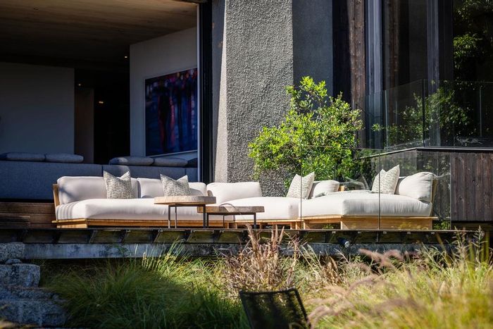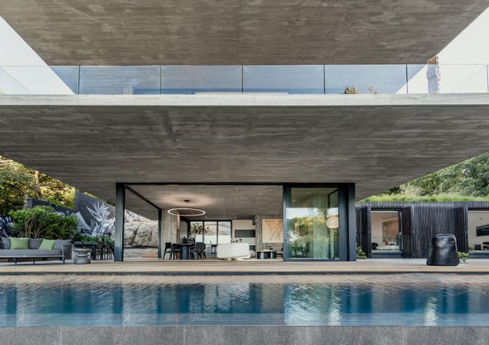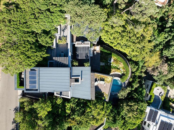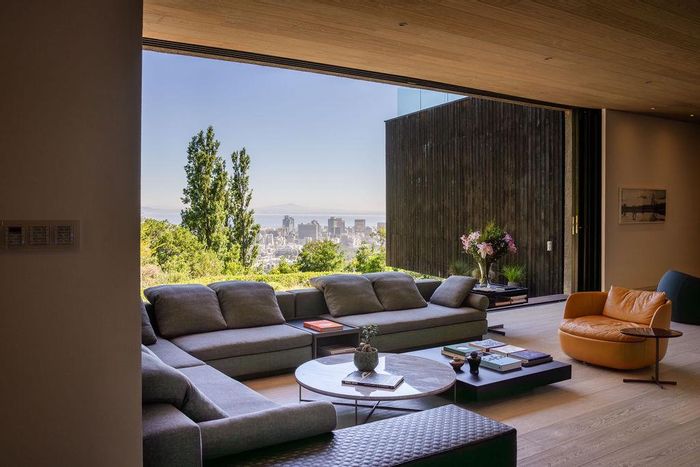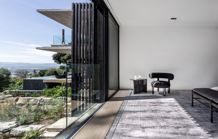 Serene Japandi retreat in an exclusive Table Mountain foothills cul-de-sac, featuring 360° views, Bulthaup/Gaggenau kitchen, 2,400-bottle wine cellar, multiple patios and private spa. 4 beds, 5.5 baths, 4-car garage.