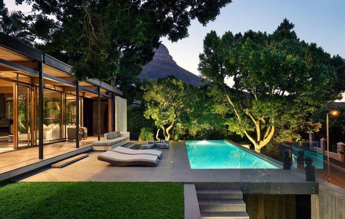 Entertainer's haven on Kensington Crescent overlooking Leeuwenhof and Lions Head, with landscaped garden, pool, antique Argentine pharmacy cabinets, covered indoor/outdoor lounge and guest cottage — 4 beds, 3 baths, double garage.