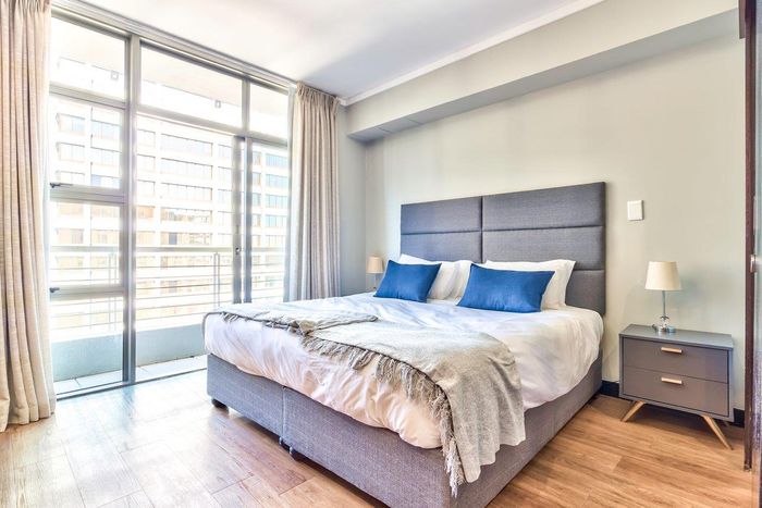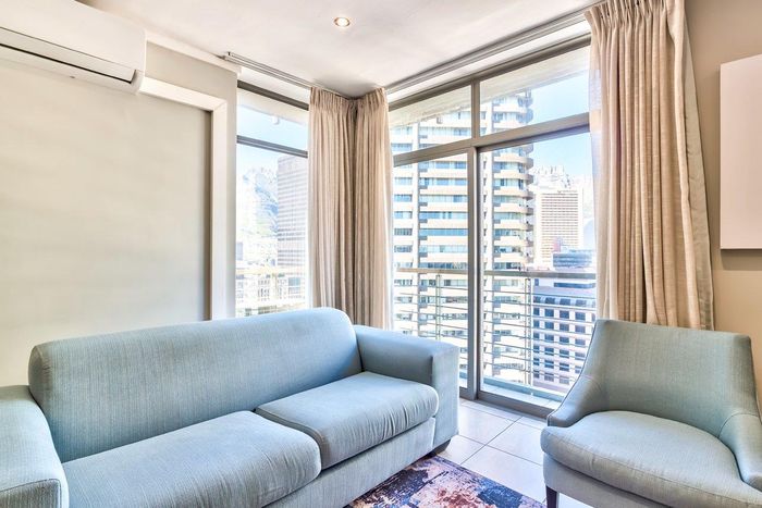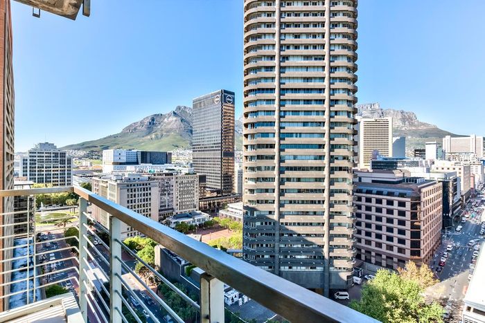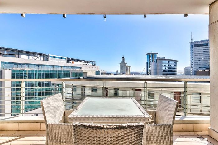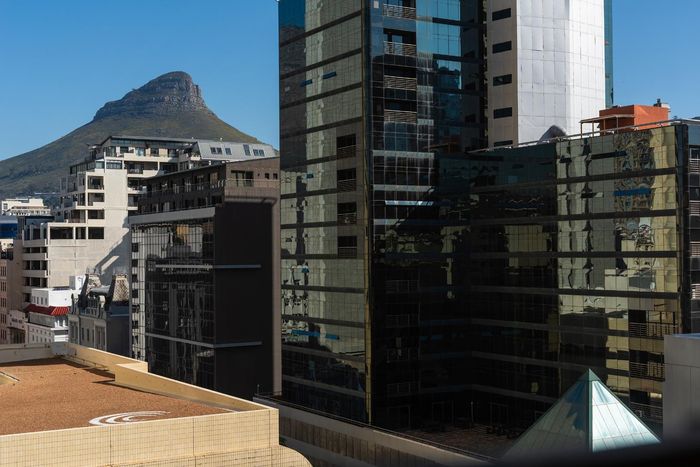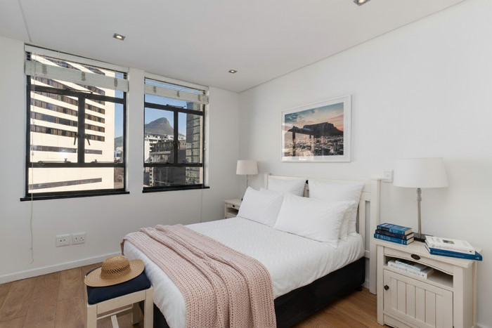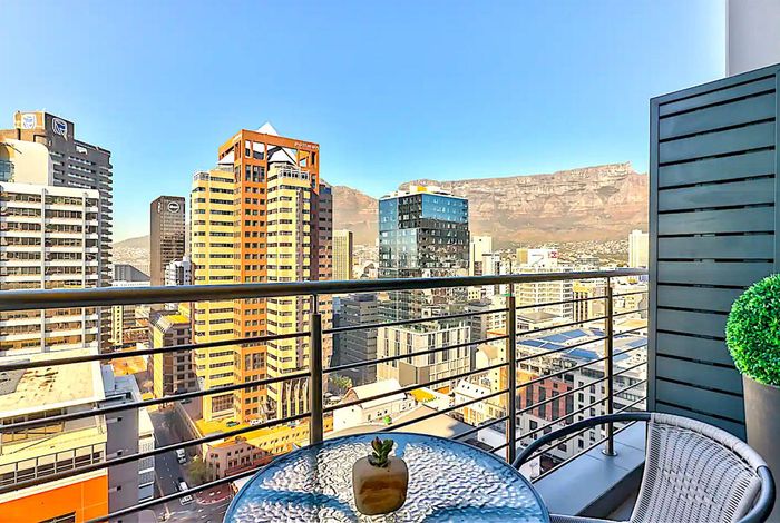 Minutes from the V&A Waterfront in Foreshore, Icon building corner apartment with mountain-view balcony, turnkey Airbnb potential, communal pool and gym — one bedroom, en-suite, secure parking.