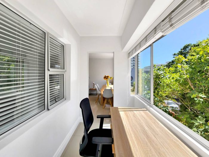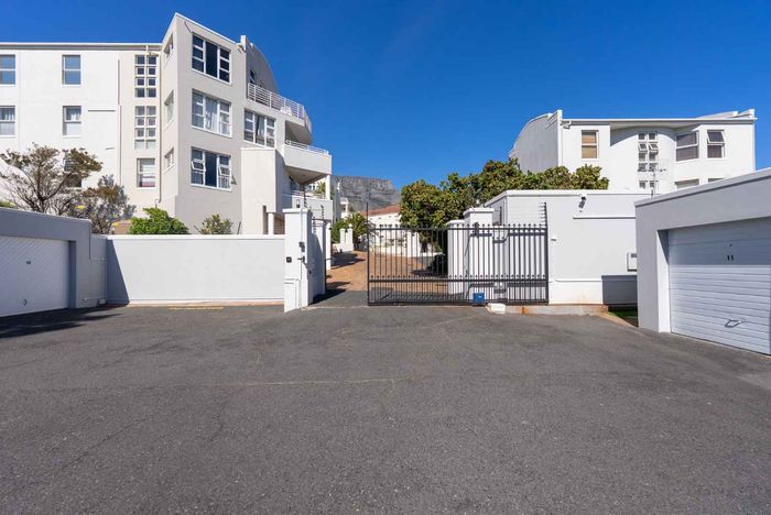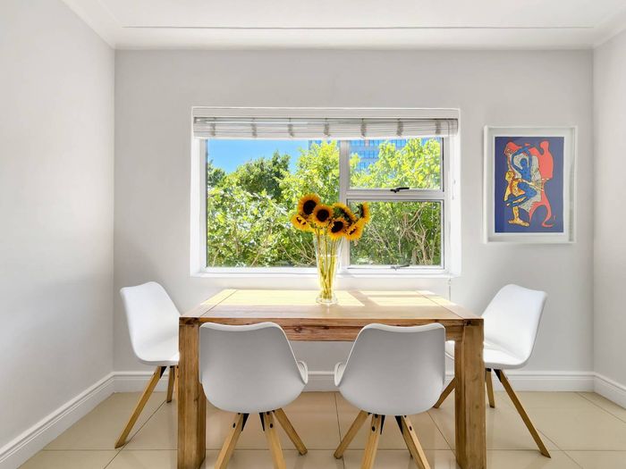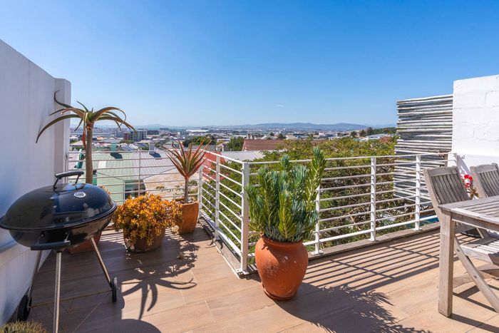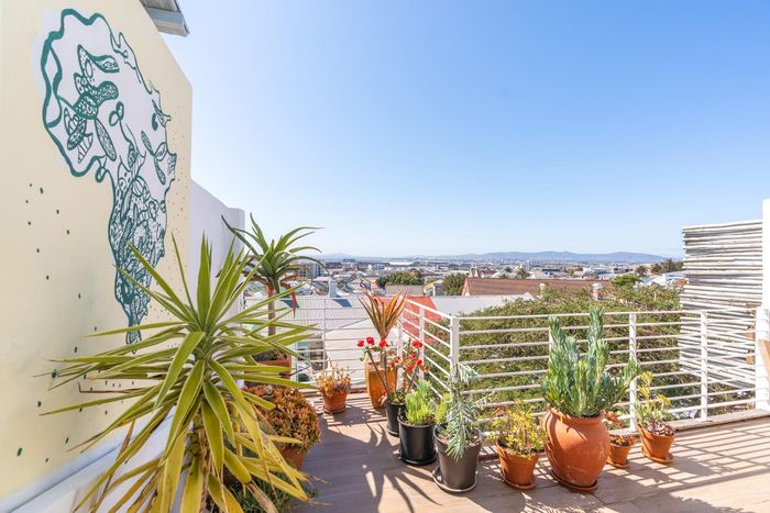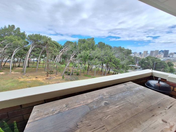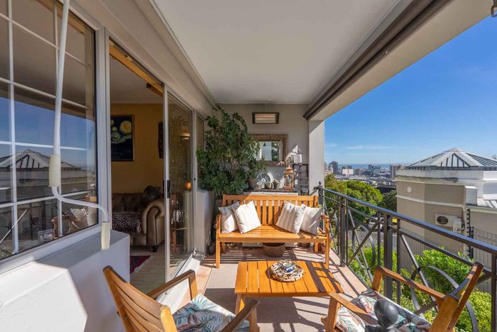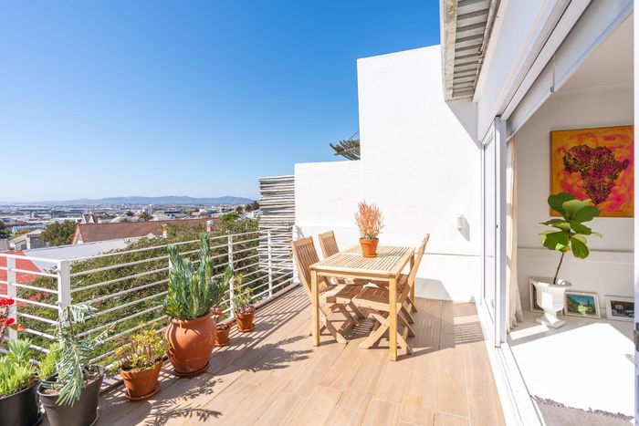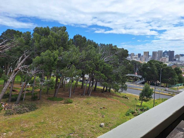 Top-floor living with park-side tranquillity in Vredehoek, balcony overlooking The Plantation's stone pines with sweeping city and mountain views; two bedrooms, one bathroom and extra-large 22sqm garage.