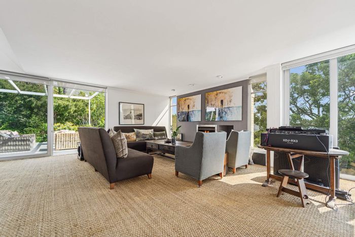 Architectural home with 360-degree views, open-plan living, three en-suite bedrooms, study, pool, and double garage.