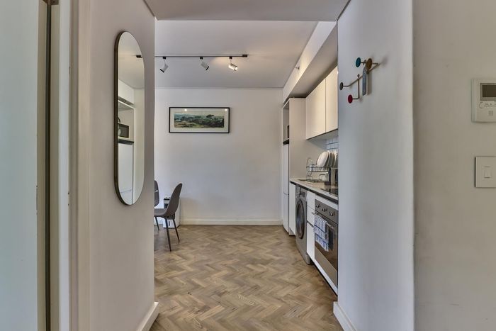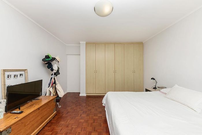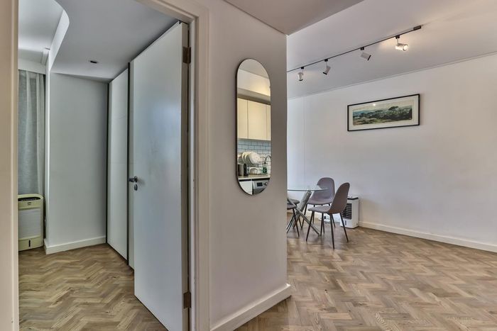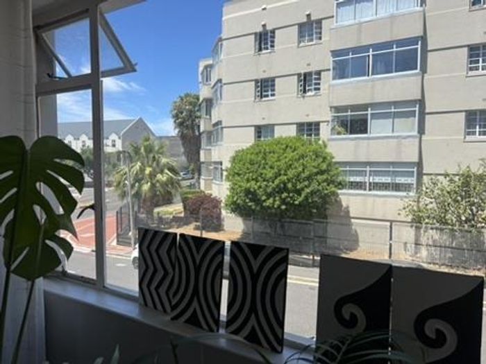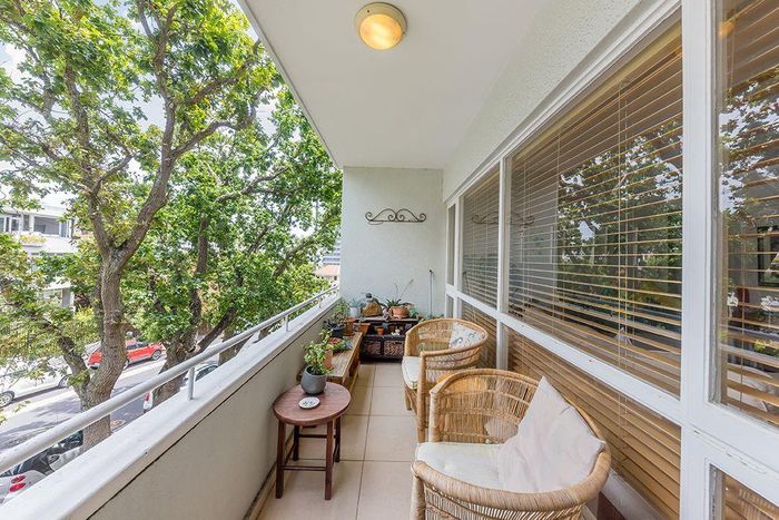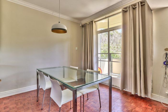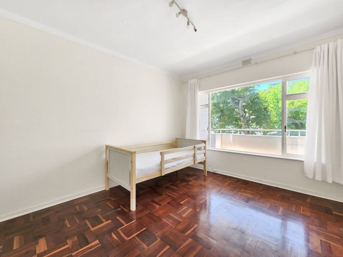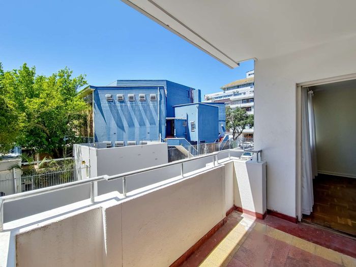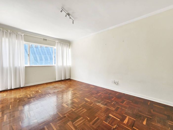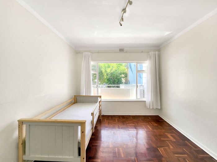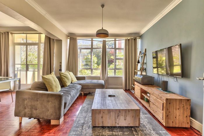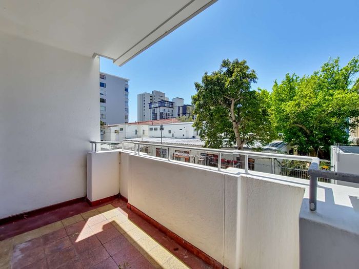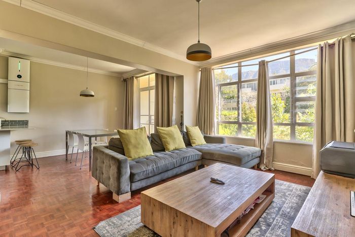 2-bedroom flat with parquet flooring, built-in cupboards, balcony views of Table Mountain, and close to cafes and shops.