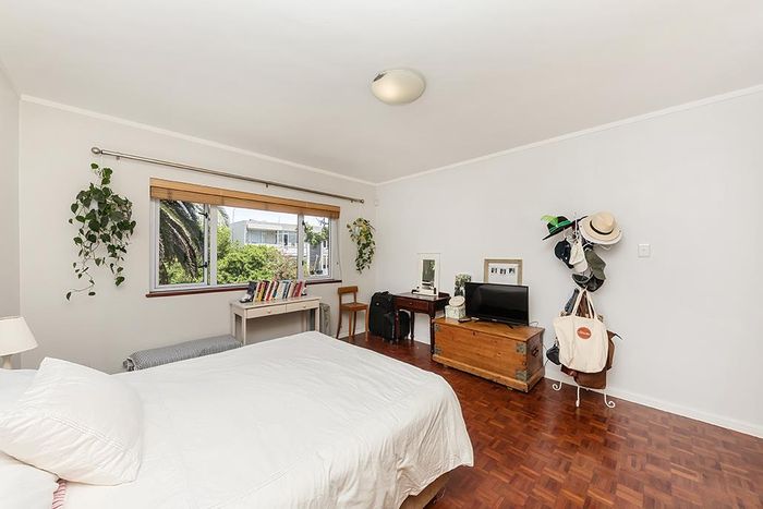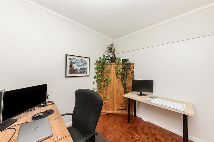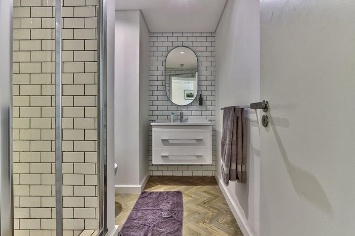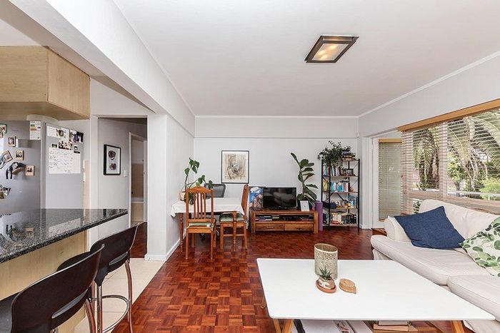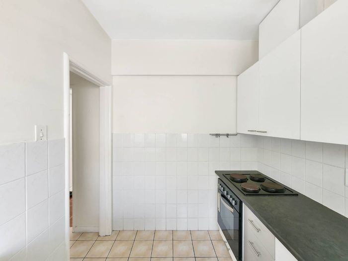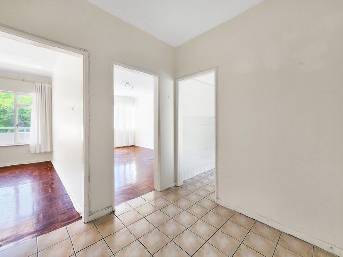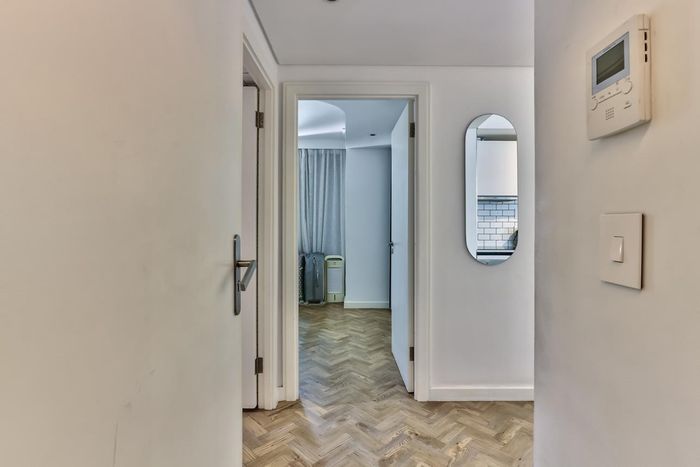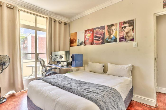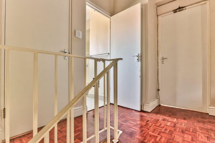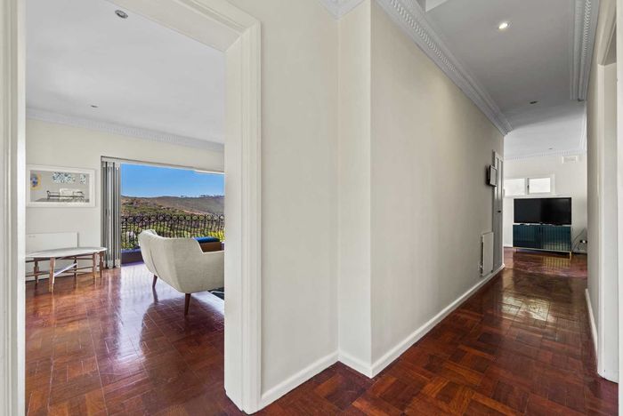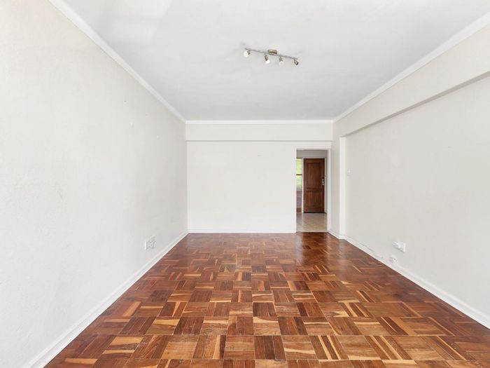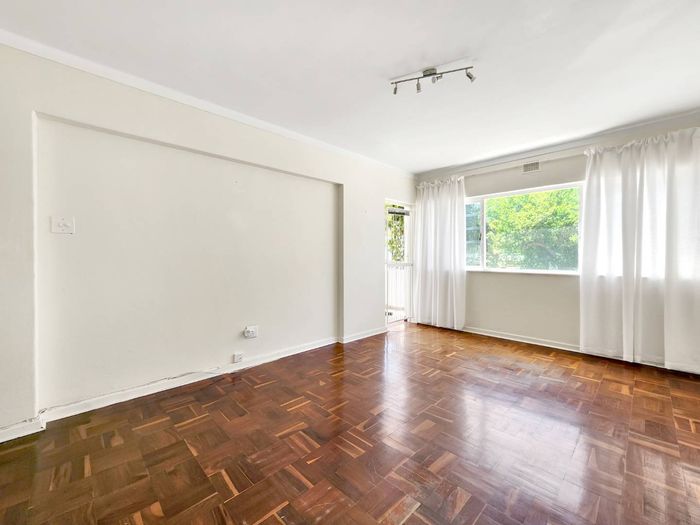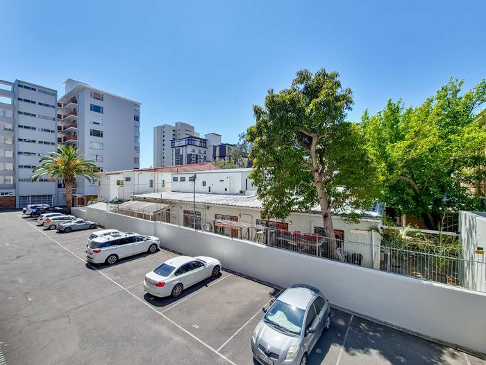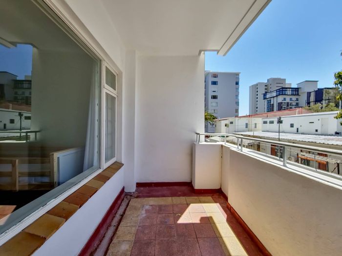 2-bedroom flat with parquet flooring, built-in cupboards, balcony views of Table Mountain, and close to cafes and shops.