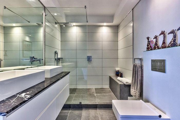 5-bedroom home with sea views, walking distance to Camps Bay beach, featuring multiple lounges, pool, and security systems.