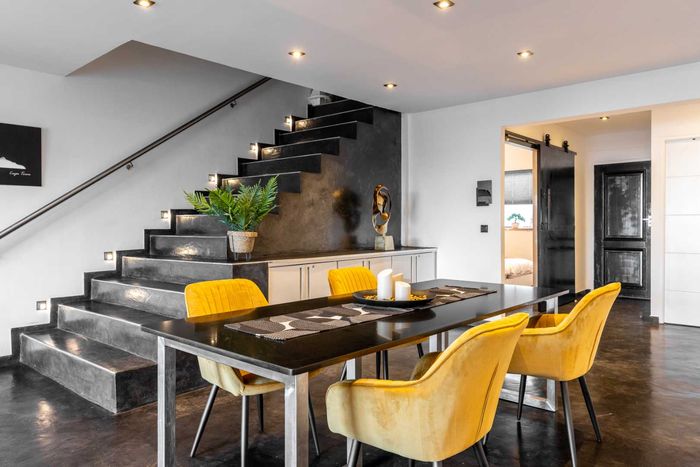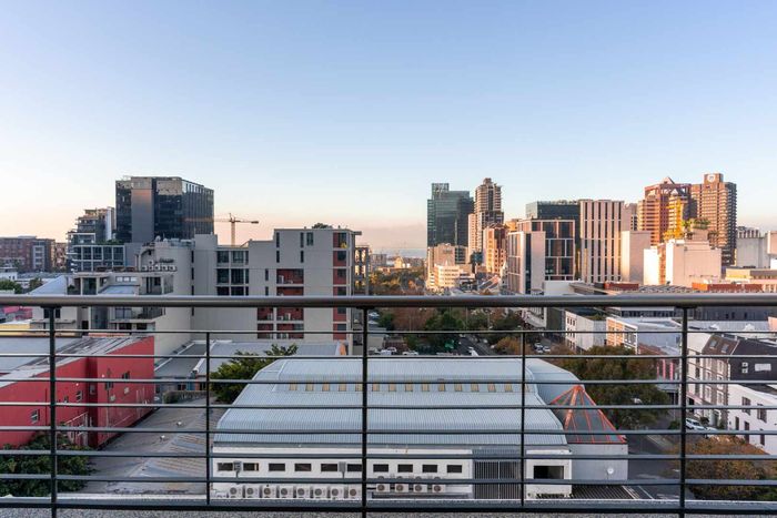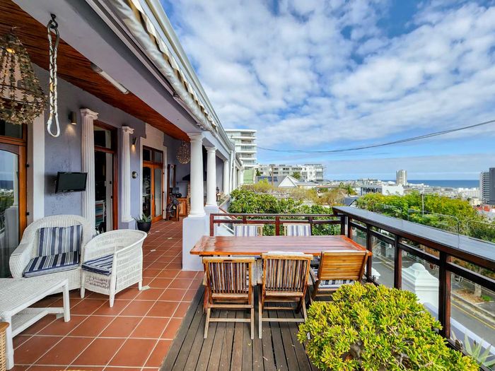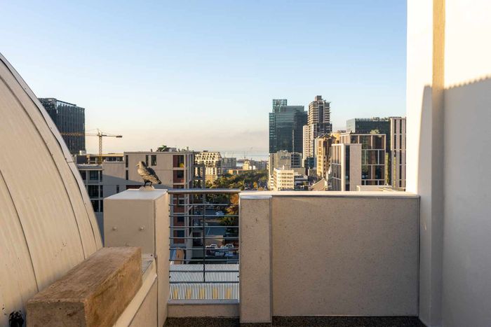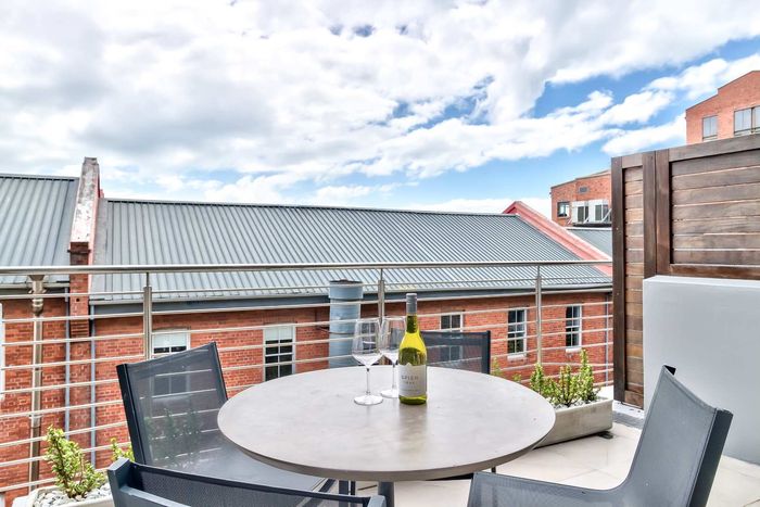 City-edge penthouse between Cape Town CBD and Bo-Kaap, steps from Tamboerskloof/De Waterkant — open-plan living with balcony and upstairs deck, European finishes, aircon throughout; 2 beds, 2 baths, secure parking.