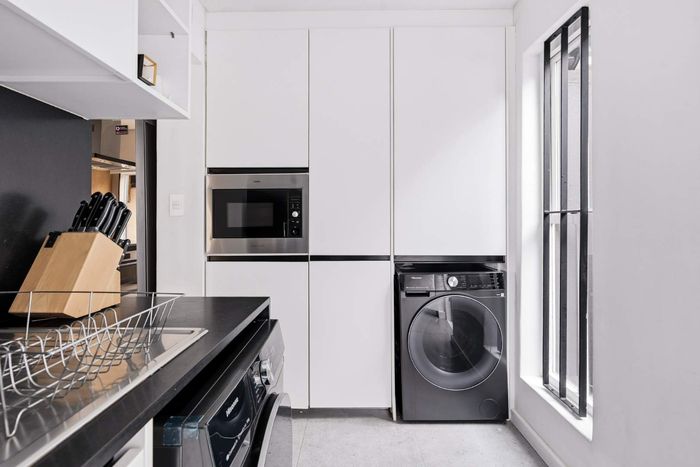 Embrace Sea Point's cosmopolitan beachside lifestyle near shops and transport; air-conditioned open-plan living opens to a balcony with sliding doors. Two bedrooms, one bath, tandem parking.