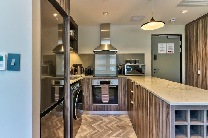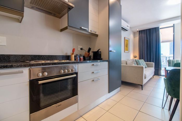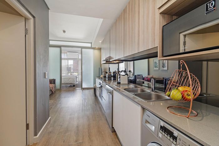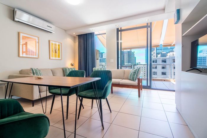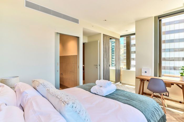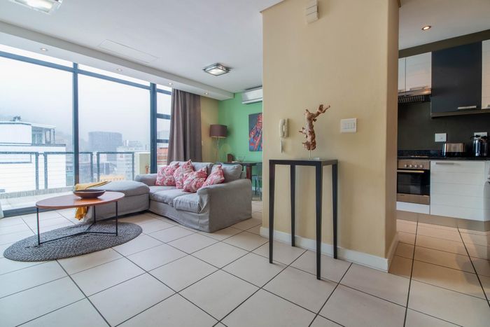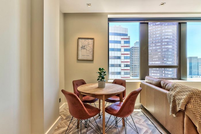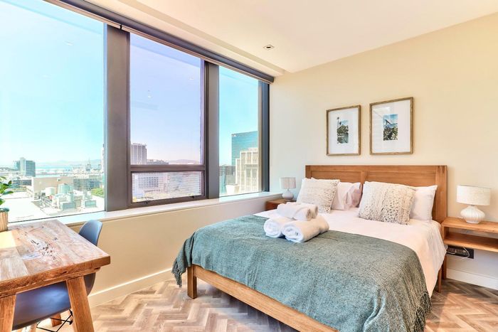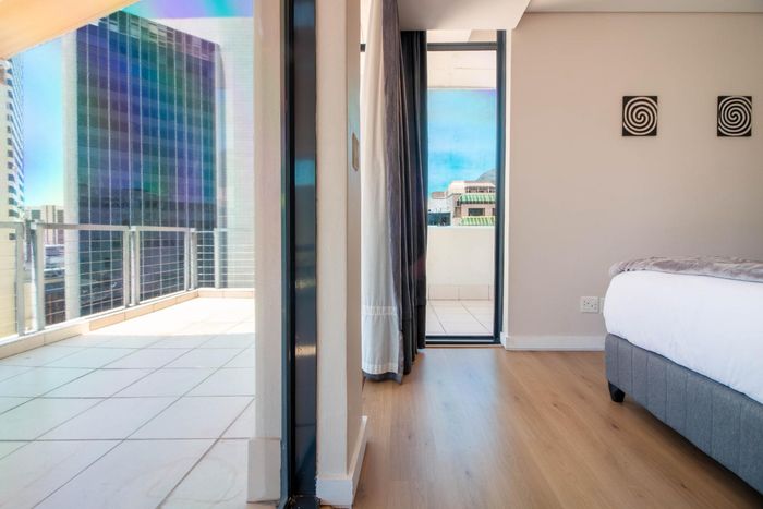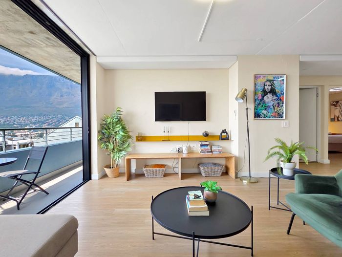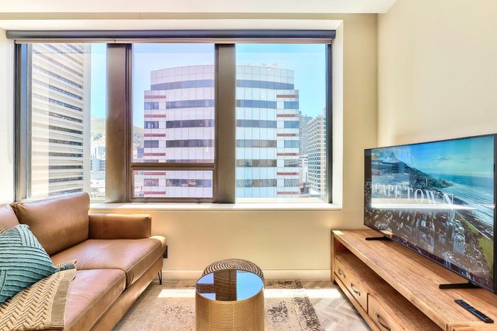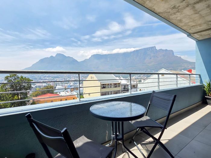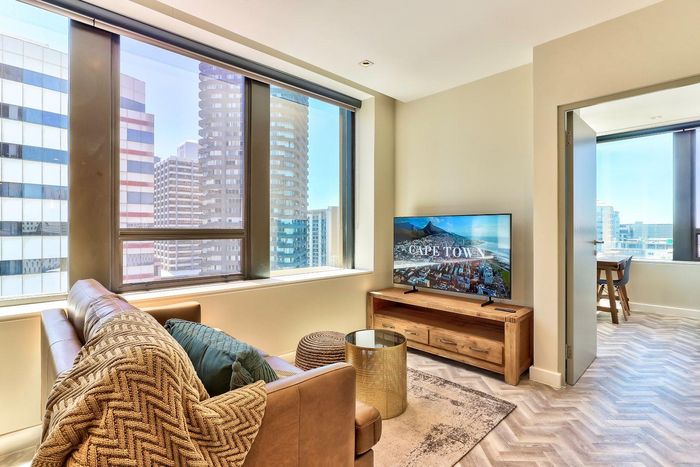 Experience vibrant CBD living with direct views of Table Mountain and Lion's Head from a private balcony; fully equipped kitchen, two bedrooms, one bathroom and secure parking bay.
