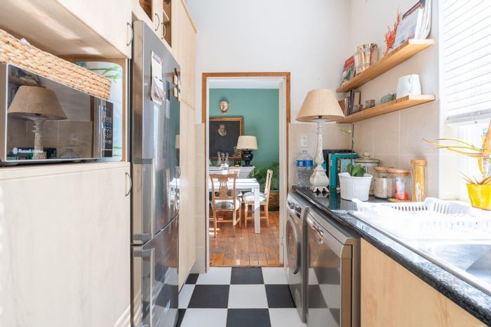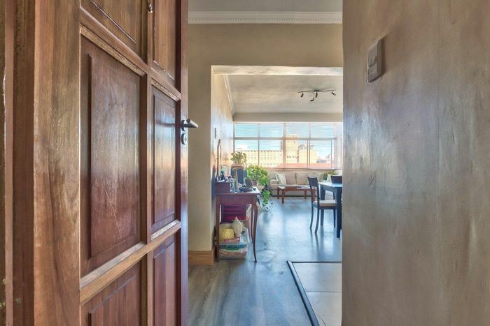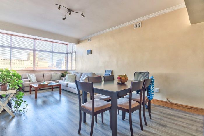 Enjoy seaside city living minutes from Sea Point promenade and cafés in Quendon Mansions — a character-rich apartment with original wooden floors and brass chandeliers, two bedrooms, one bathroom.
