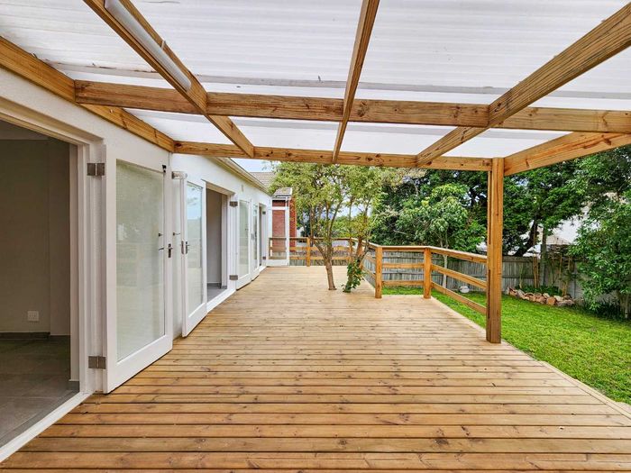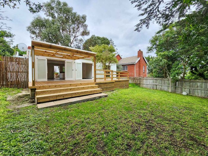 2-bedroom, 1-bathroom home with open-plan living, spacious kitchen, outdoor deck, landscaped garden, and secure parking near the beach.