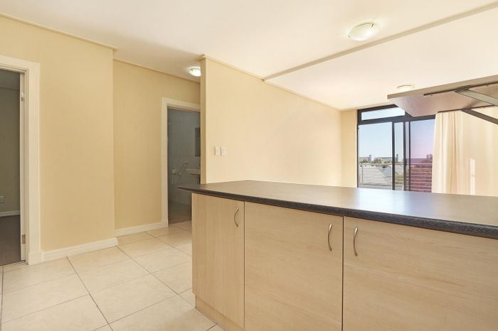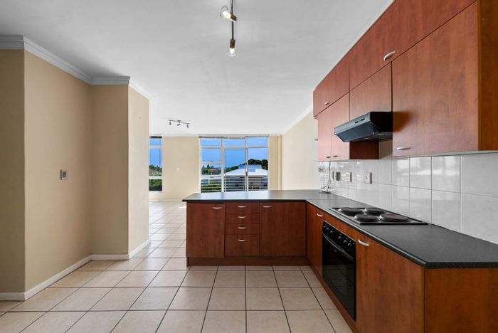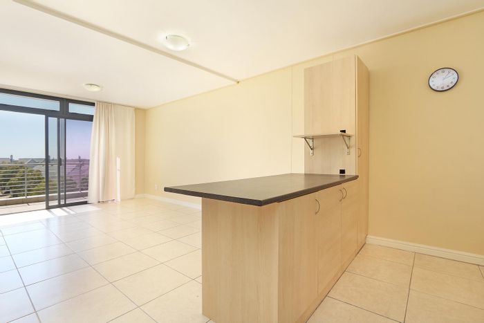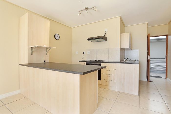Entertain from a modern island kitchen and relax on a spacious balcony with views in a 24-hour manned security estate — gym, braai, lounge; 2 beds, 1 bath, two secure bays.