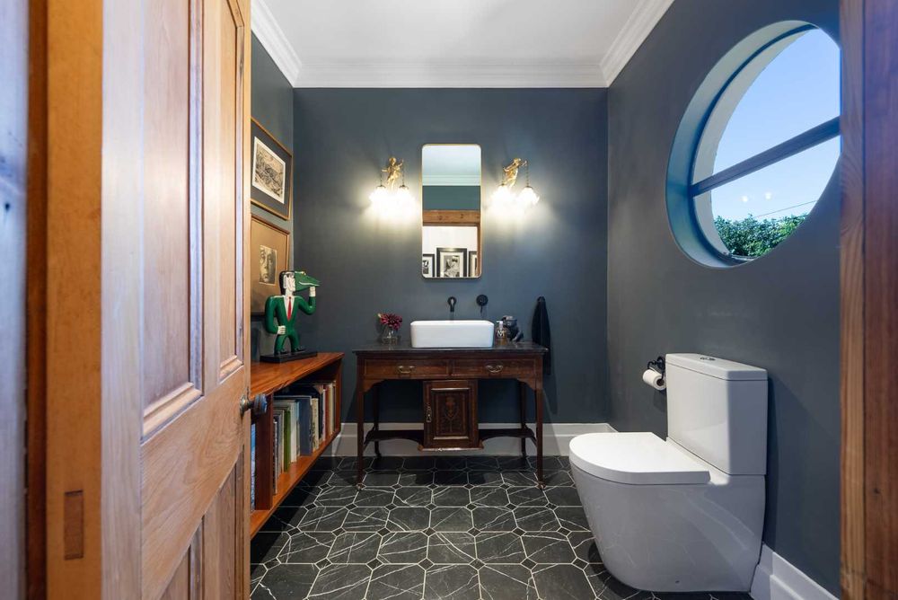 Now, imagine stepping under the moulded hood over the arched opening to the teak front door. Inside, radiating from around the central foyer and wooden staircase, are a formal dining room (currently used as a study), and a lounge with a beautiful wooden banquette nestled under the window. At the end of the hall is a large kitchen/dining room, where a third reception room has been combined with the kitchen to form the warm heart of this home, with MasterCrafter joinery, Dekton surfaces, and a gas hob and Smeg oven. Downstairs also includes a guest bathroom for convenience.