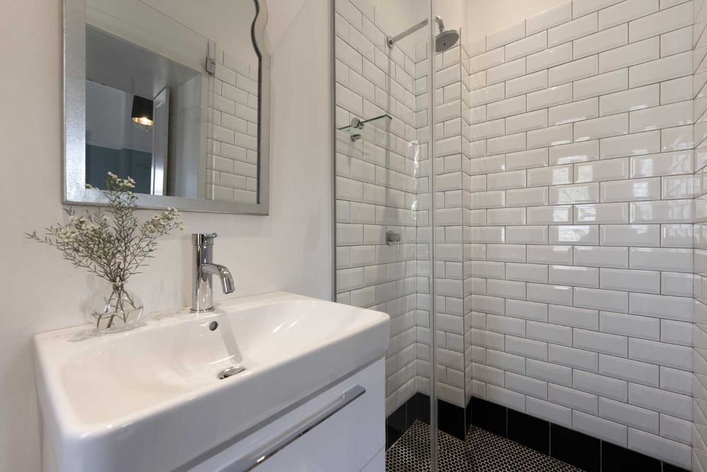 Make your way up the original mahogany staircase, and you will find four bedrooms around the landing area. The main bedroom is enchanting - spacious, with a sunny seating area in the bay window, and secondary glazing on the windows for added insulation. It features a dressing area and a stunning newly added en-suite bathroom with a bath and shower. There is an inviting guest bedroom with its en-suite bathroom camouflaged behind a jib door in the extensive built-in cupboards. There are two more bedrooms sharing another renovated bathroom.
