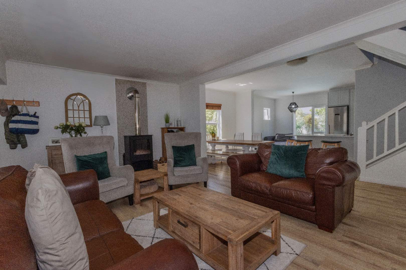 The spacious, open-plan living areas flow effortlessly into a private, enclosed garden featuring a sparkling blue pool and a covered, wind-sheltered patio — ideal for relaxing or entertaining. A convenient guest loo completes the downstairs layout.