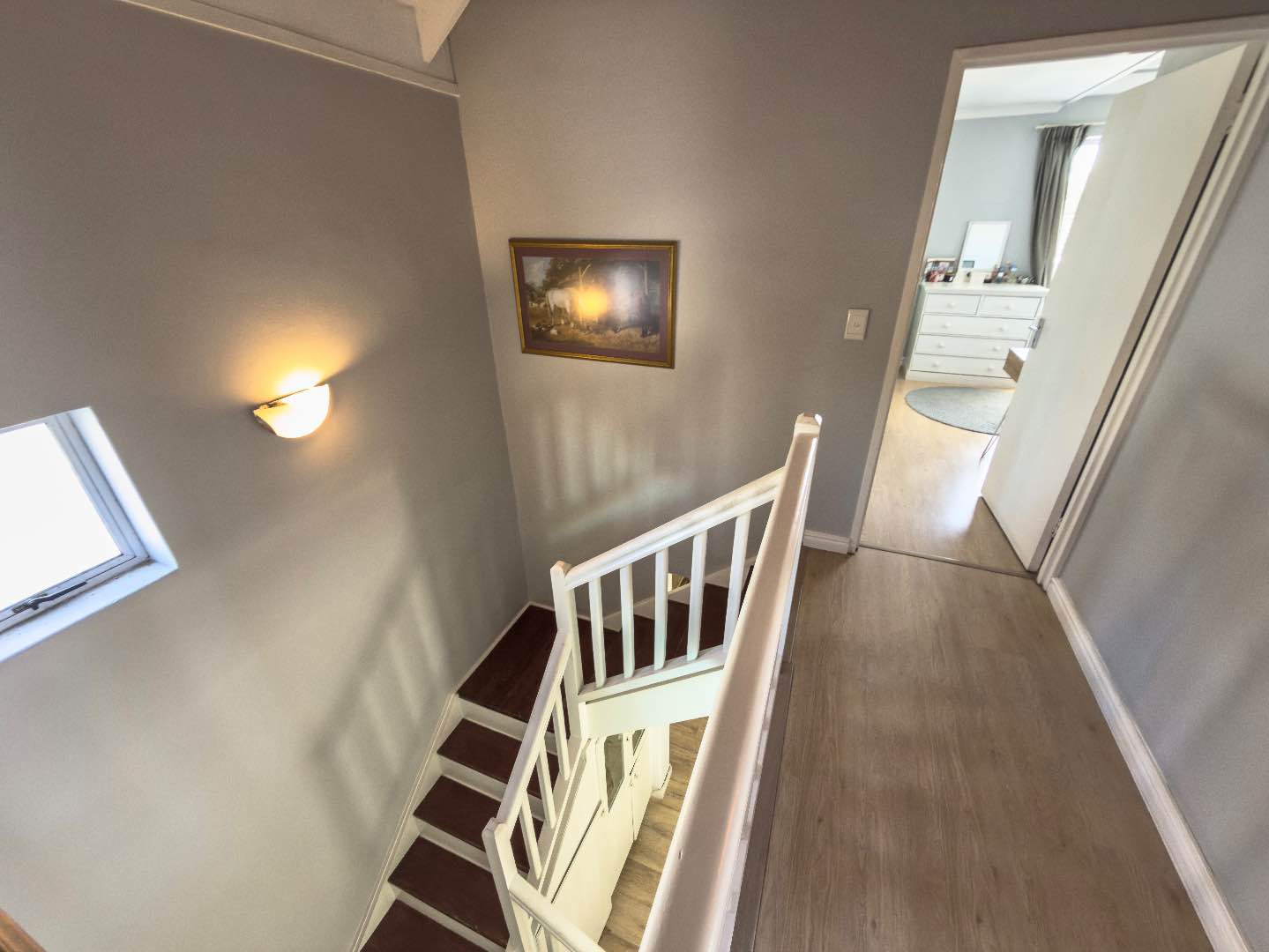 Upstairs features three bedrooms, including a sun-filled main bedroom facing north-west, with exposed roof trusses, and an en-suite bathroom. The main bedroom has a walk-in closet.
