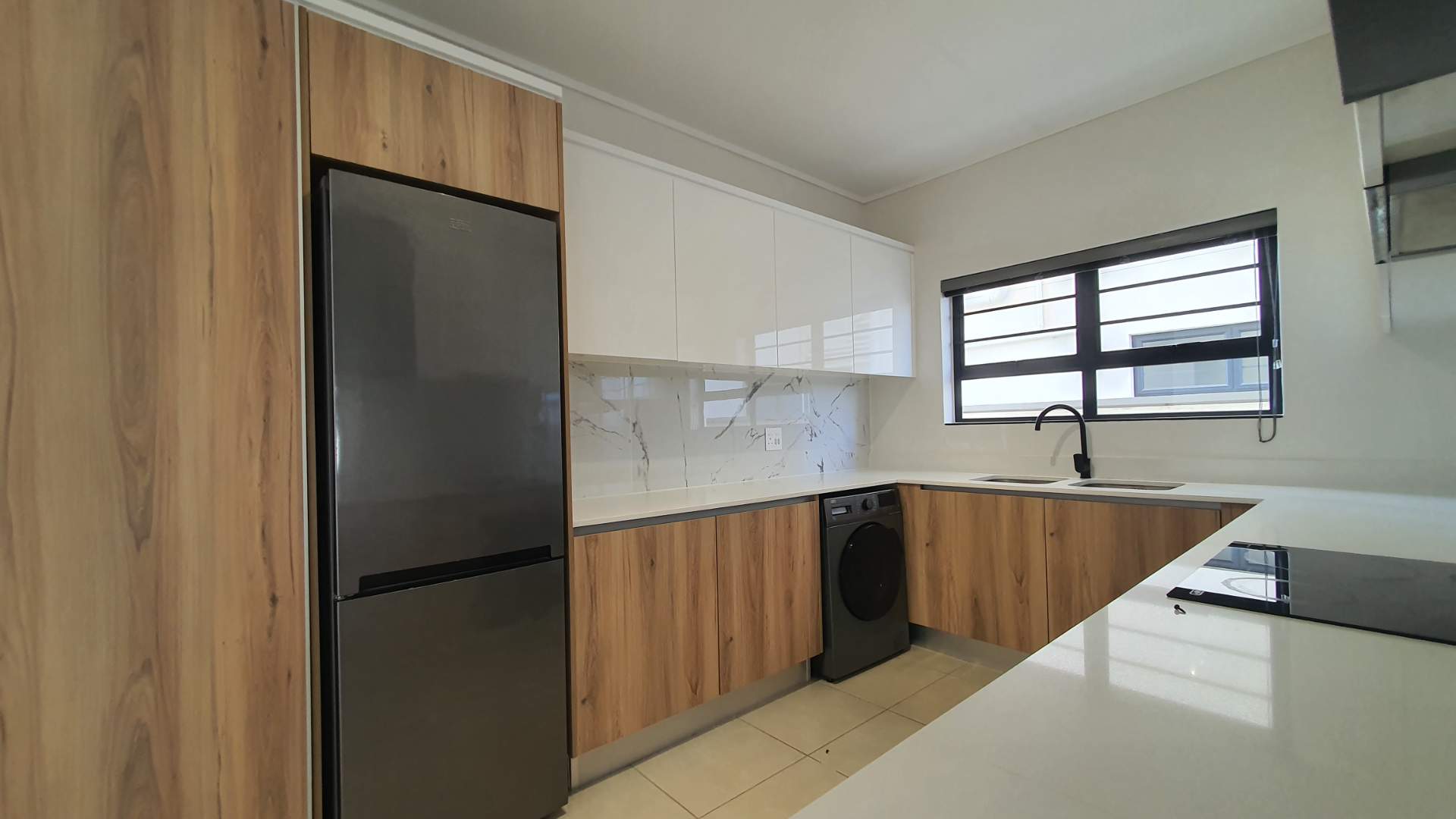 Step inside to discover three spacious bedrooms, each featuring floor-to-ceiling built-in cupboards. The master bedroom boasts an elegant en-suite bathroom, while a second full bathroom serves the additional bedrooms, ensuring ample space for family or guests. The heart of the home is the expansive lounge and dining area, which seamlessly integrates with the open-plan kitchen. Adorned with sleek engineered stone countertops, the kitchen is a chef's delight and includes a fridge/freezer, washing machine, and dishwasher for your convenience.