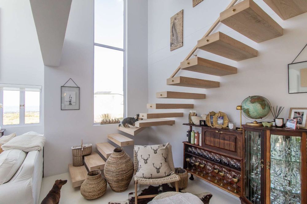 Practicality meets luxury with a well-thought-out scullery and pantry, while soaring ceilings in the living area amplify the home's airy, open feel. A striking staircase with expansive glass windows leads you to the first floor, where three more bedrooms await. The master suite is an oasis of serenity, featuring a lavish en suite bathroom, walk-in closets, and a private balcony with uninterrupted ocean views. The master bathroom's freestanding tub is perfectly positioned to soak in the beauty of the coastline through floor-to-ceiling windows.