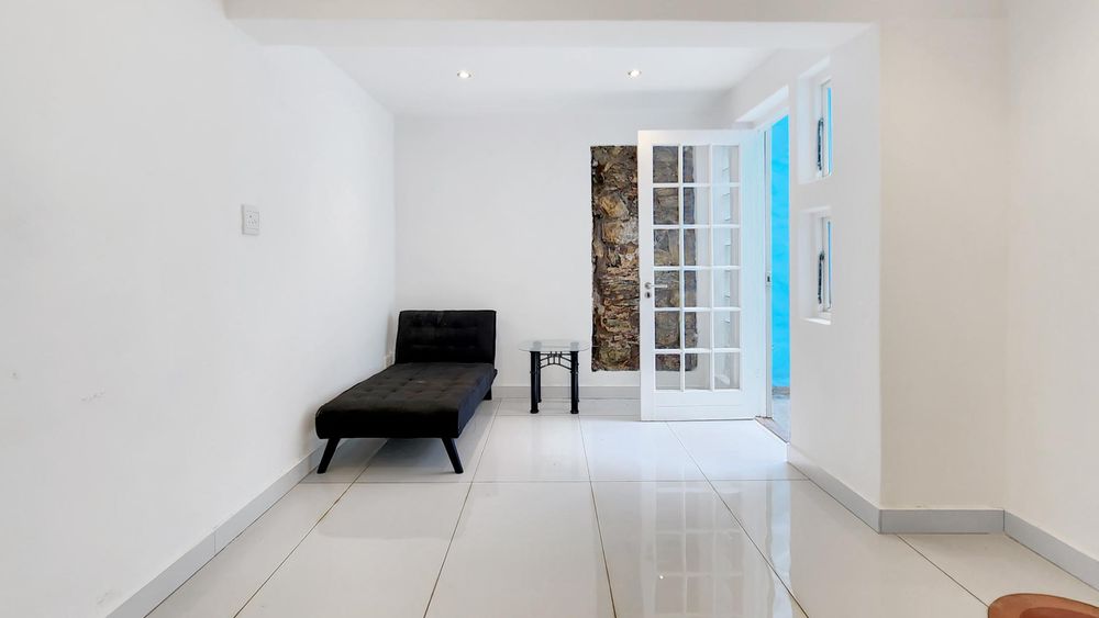 This home offers: - A spacious lounge with an open serving window to the kitchen, perfect for entertaining. - The kitchen is white and bright, modern with plenty of storage, a glass-top stove, and plumbing for one appliance. It has a mezzanine level ideal for study/office use, guest sleeping nook, or convenient storage - A second living area at the back of the house flows to a small private garden, a quiet retreat and fresh air in the city - One bedroom and one bathroom (shower, toilet, basin).