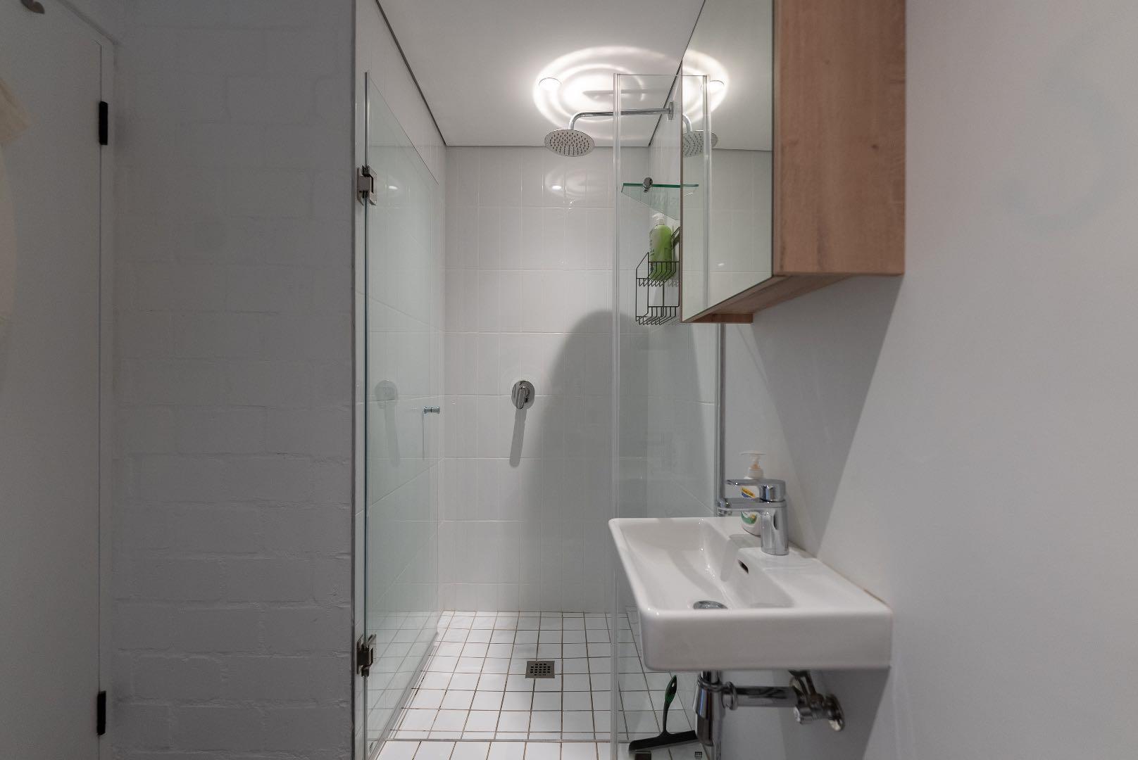 This thoughtfully designed open plan studio maximizes space and functionality, creating a welcoming living area that extends to a balcony. The modern bathroom features a shower.