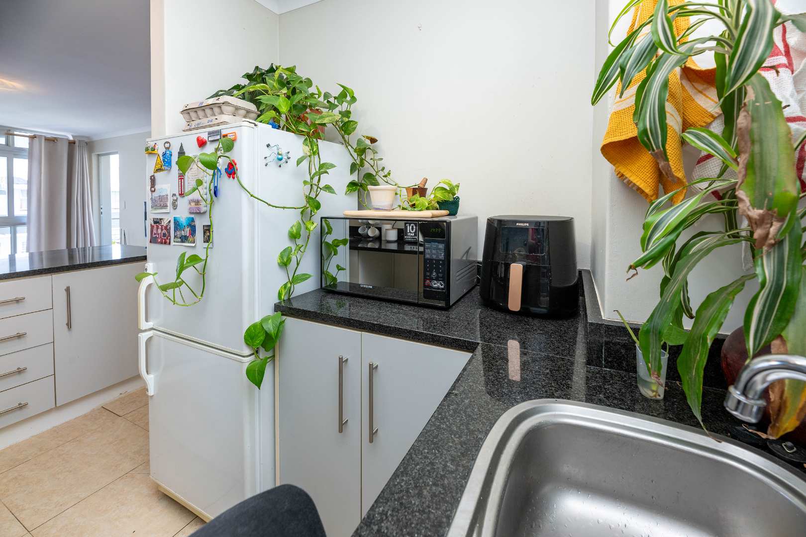 Open plan kitchen plumbed for 2 appliances washing machine and dishwasher.